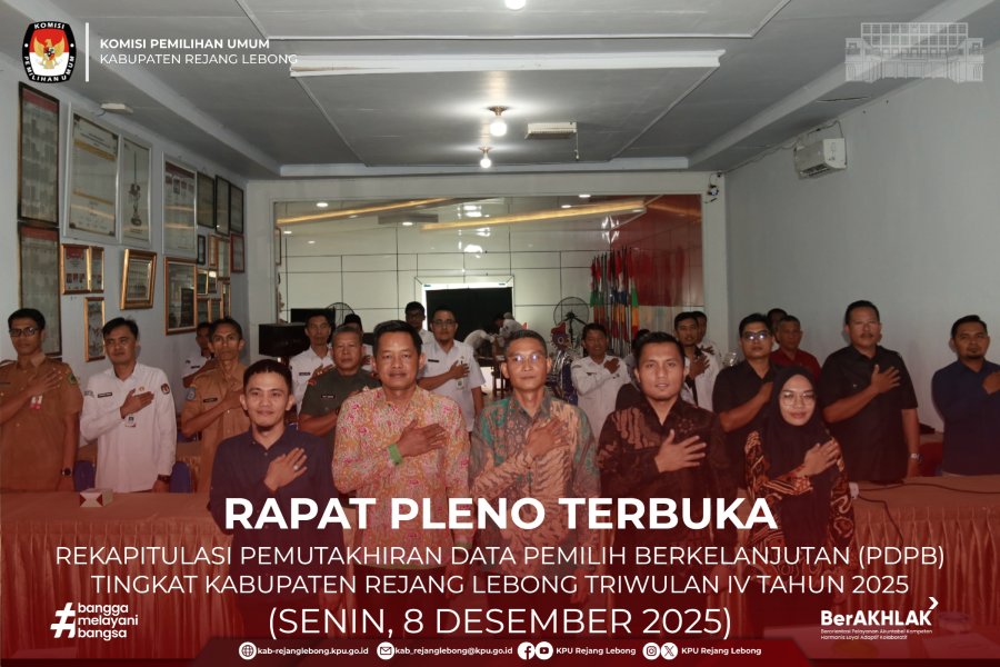 TemanPemilih, KPU Kabupaten Rejang Lebong telah Melaksanakan Rapat Pleno Terbuka Rekapitulasi Pemutakhiran Data Pemilih Berkelanjutan (PDPB) Tingkat Kabupaten Rejang Lebong Triwulan IV Tahun 2025, Senin (8/12/2025)