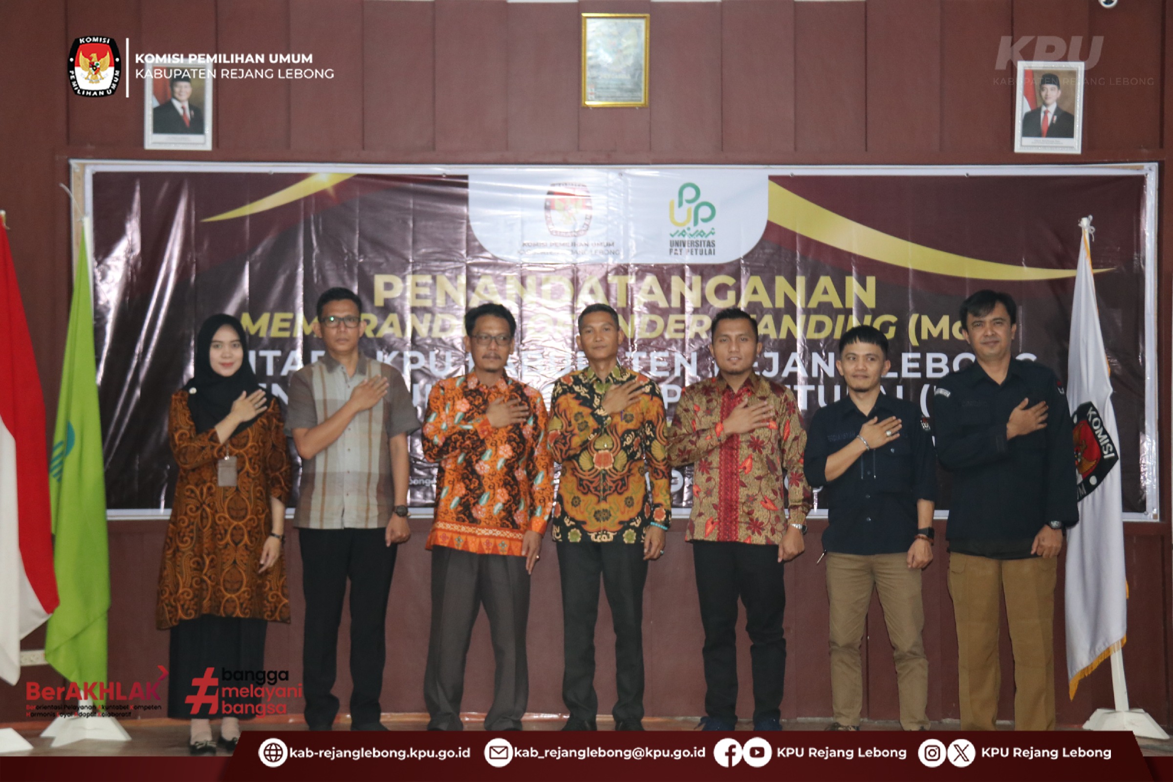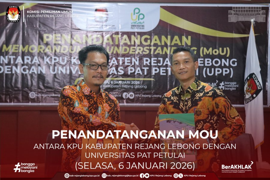 Penandatangan MoU tersebut secara langsung dilakukan oleh Ketua KPU kabupaten Rejang Lebong dan Rektor Universitas Pat Petulai Dr. H. Rahiman Dani, M.A. KPU Kabupaten Rejang Lebong melaksanakan kegiatan penandatanganan Nota Kesepahaman (MoU) dengan Universitas Pat Petulai (UPP) terkait kerja sama pendidikan pemilih dan penguatan demokrasi. Kegiatan ini dilaksanakan di luar tahapan Pemilu sebagai bagian dari upaya berkelanjutan KPU dalam meningkatkan literasi demokrasi dan partisipasi masyarakat, khususnya kalangan akademisi dan pemilih muda