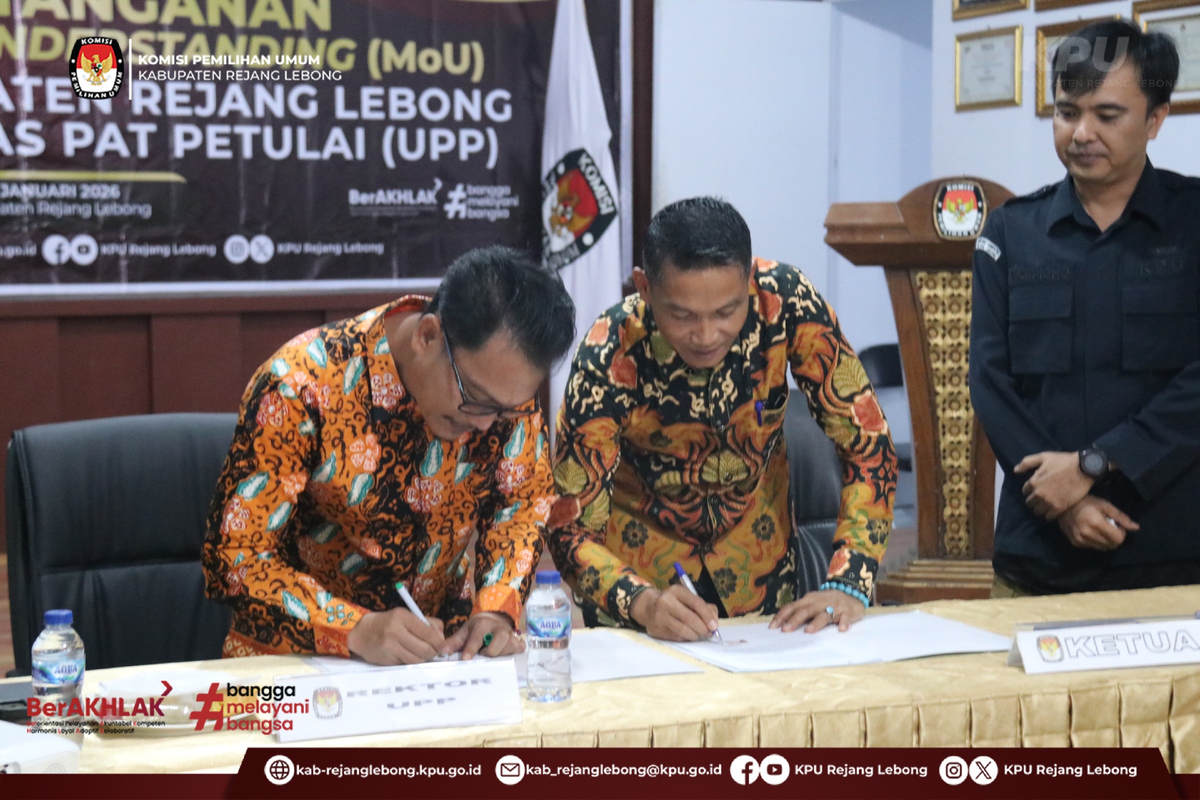 #TemanPemilih, KPU Kabupaten Rejang Lebong Melakukan Penandatangan Memorandum of Understanding ) MoU antara KPU Kabupaten Rejang Lebong dengan Universitas Pat Petulai (UPP) di Aula Kantor KPU kabupaten Rejang Lebong, Selasa (6/1/2026) Pagi.