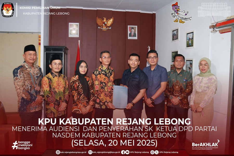 Dalam hal Ini DPD Partai NasDem juga Menyerahkan SK Ketua DPD Nasdem Kabupaten Rejang Lebong kepada KPU Kabupaten Rejang Lebong yang diterima langsung oleh Ketua KPU Kabupaten Rejang Lebong Ujang Maman beserta Anggota.