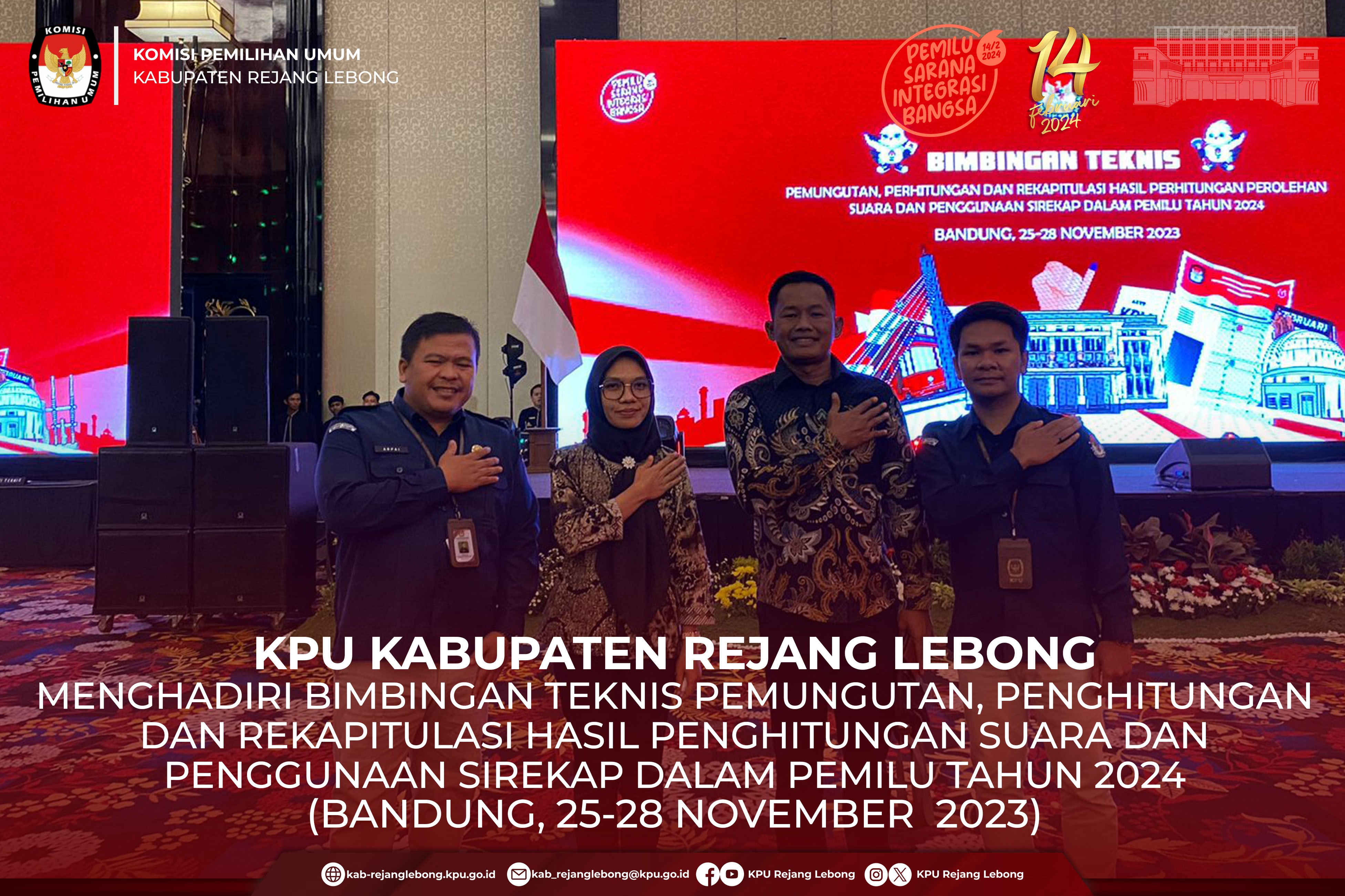 #TemanPemilih, Anggota KPU Kabupaten Rejang Lebong Divisi Teknis Penyelenggaraan Pemilu Eiis Purwanti dan Divisi Perencanaan Data dan Informasi Muhammad Anas Kholiq bersama Kasubbag TPPPHM dan Operator Sidalih mengahdiri Bimbingan Teknis Pemungutan, Penghitungan dan Rekapitulasi Hasil Penghitungan Suara dan Penggunaan Sirekap Dalam Pemilu Tahun 2024, Bandung (25-28 November 2023)