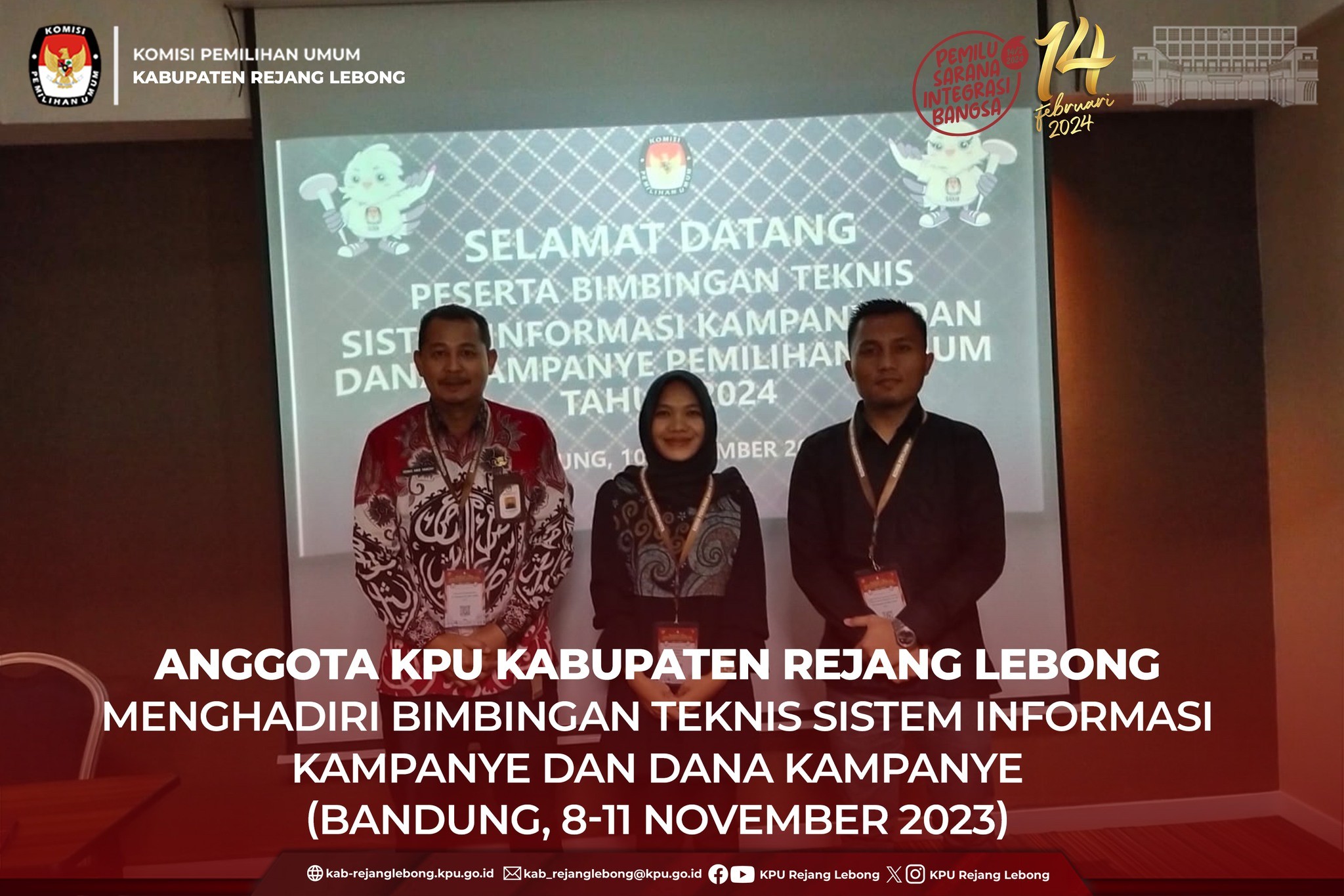 #TemanPemilih, Anggota KPU Kabupaten Rejang Lebong Divisi Teknis Penyelenggaraan Pemilu Eiis Purwanti dan Divisi Sosdiklih Parmas dan SDM Buyono di dampingi oleh Admin SIKADEKA KMS Amir Hamzah menghadiri Bimbingan Teknis Sistem Informasi Kampanye dan Dana Kampanye, Bandung 8-11 November 2023