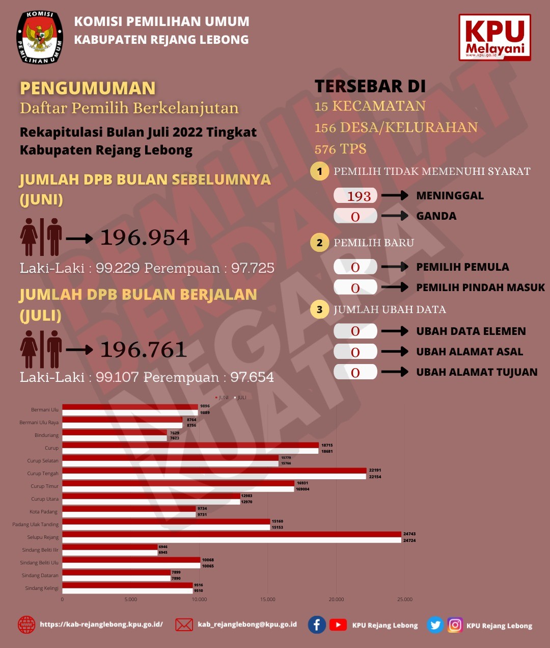 KPU Kabupaten Rejang Lebong telah melakukan Rekapitulasi Daftar pemilih Berkelanjutan (DPB) bulan Juli tahun 2022 yang bersumber dari Berita Acara Pleno penetapan DPB yang dilaporkan KPU Kabupaten Rejang Lebong untuk bulan Juli 2022.