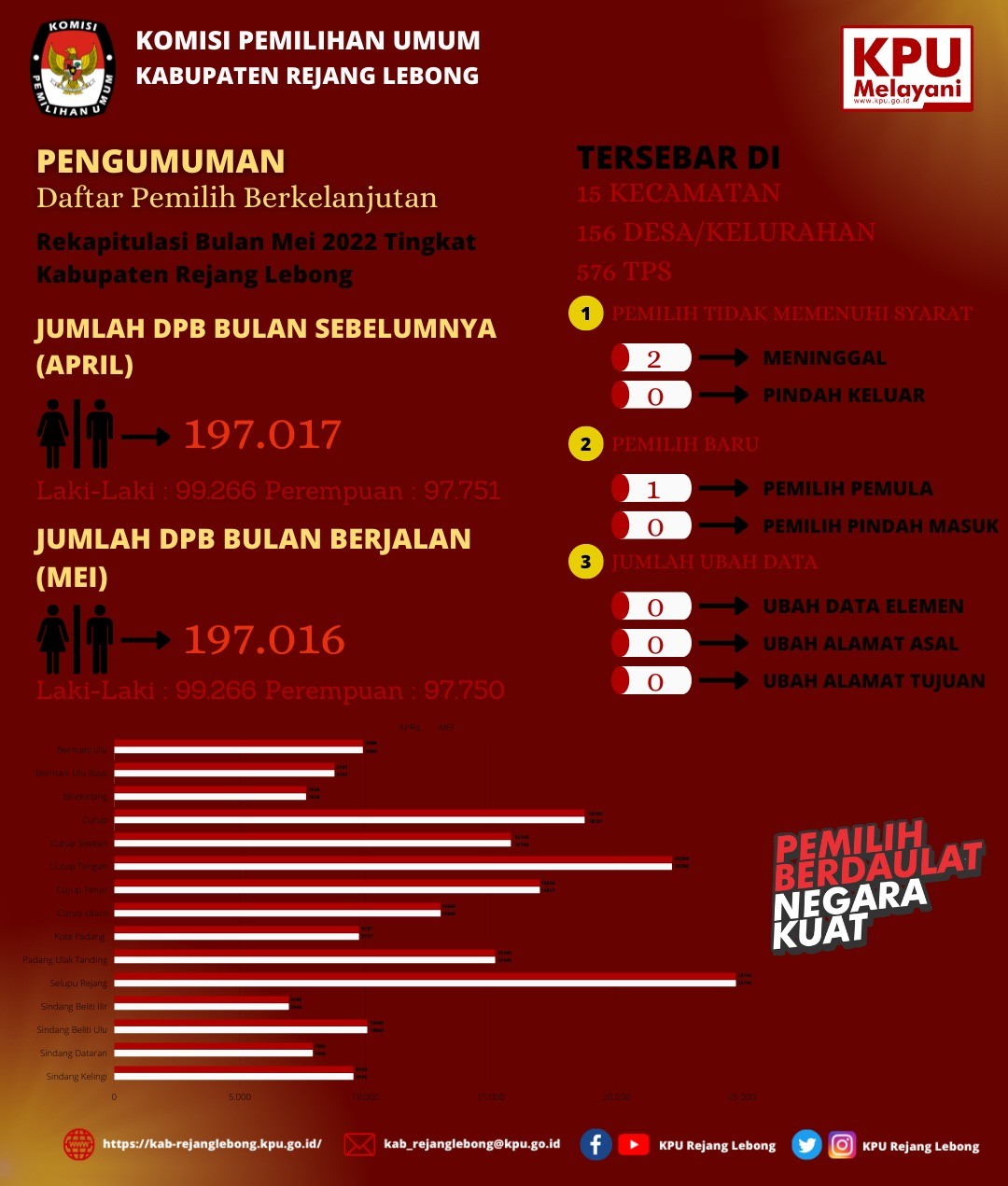 KPU Kabupaten Rejang Lebong telah melakukan Rekapitulasi Daftar pemilih Berkelanjutan (DPB) bulan Meil tahun 2022 yang bersumber dari Berita Acara Pleno penetapan DPB yang dilaporkan KPU Kabupaten Rejang Lebong untuk bulan Mei 2022.