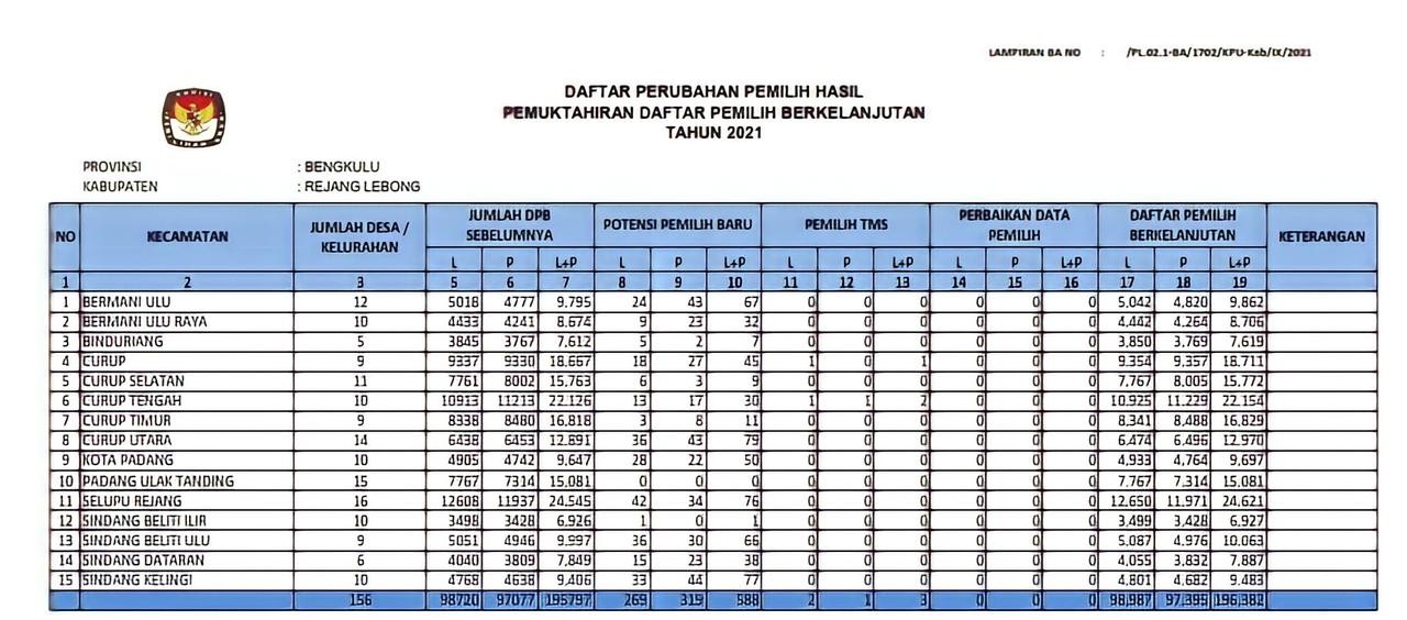 KPU Kabupaten Rejang Lebong mengumumkan Daftar Perubahan Pemilih Hasil Pemuktahiran Daftar Pemilih Berkelanjutan Tahun 2021