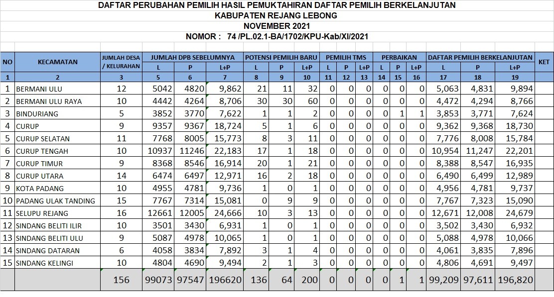 berdasarkan hasil rapat pleno Anggota KPU Kabupaten Rejang Lebong pada tanggan 30 November 2021 bahwa hasil Pemuktahiran pemilih Berkelanjutan tahun 2021, berjumah 196,820 Pemilih yang terbagi dalam 15 Kecamatan se Kabupaten Rejang Lebong