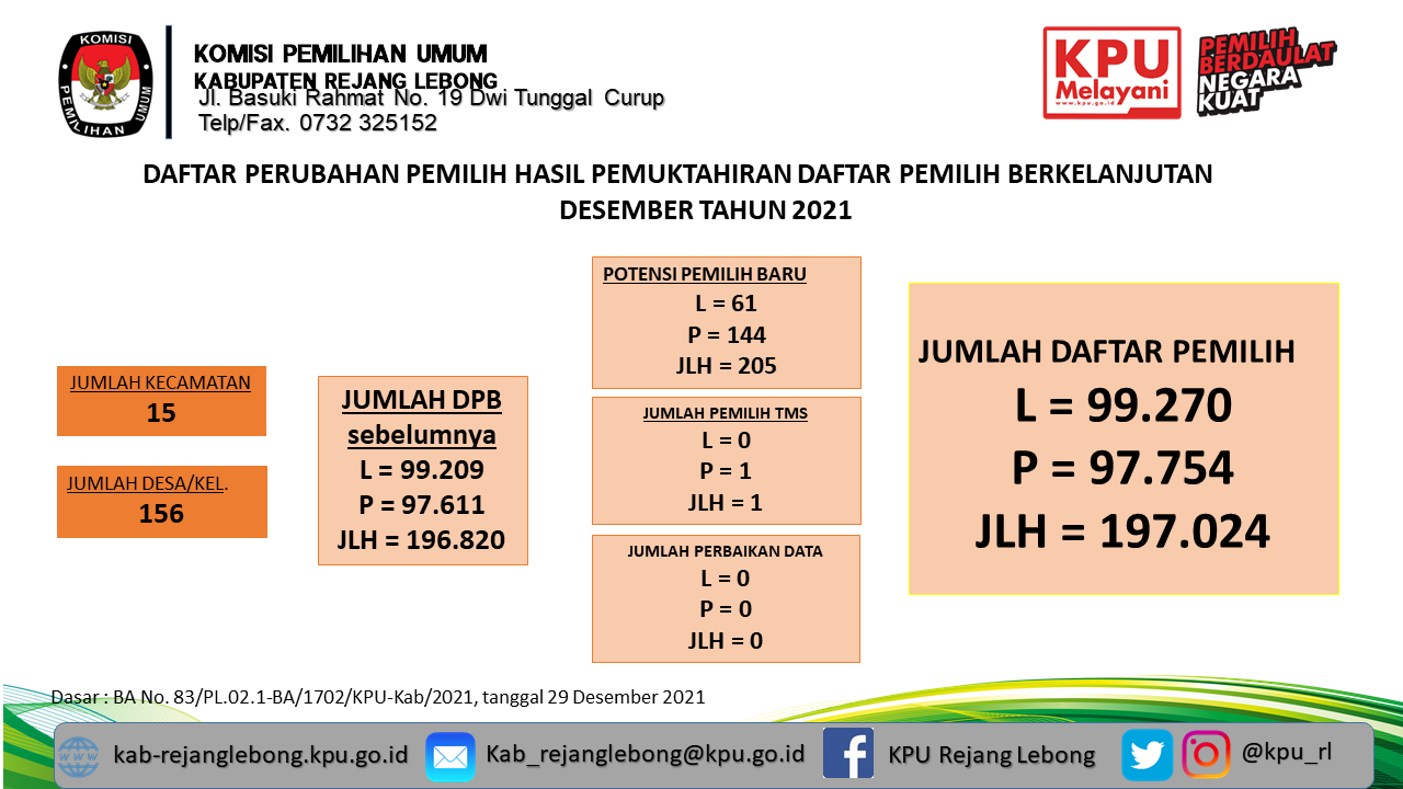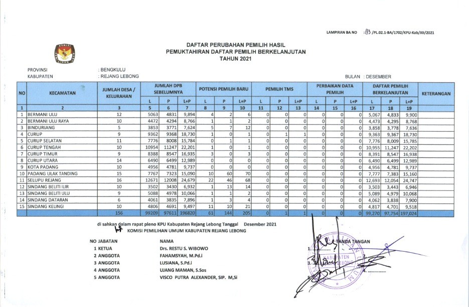 Curup, 29 Desember 2021, KPU Kabupaten Rejang Lebong mengumumkan daftar perubahan pemilih hasil pemuktahiran daftar pemilih berkelanjutan tahun 2021 dengan Nomor Berita Acara : 83.PL.02.1-BA/1702/KPU-Kab/XII/2021 tanggal 29 Desember 2021