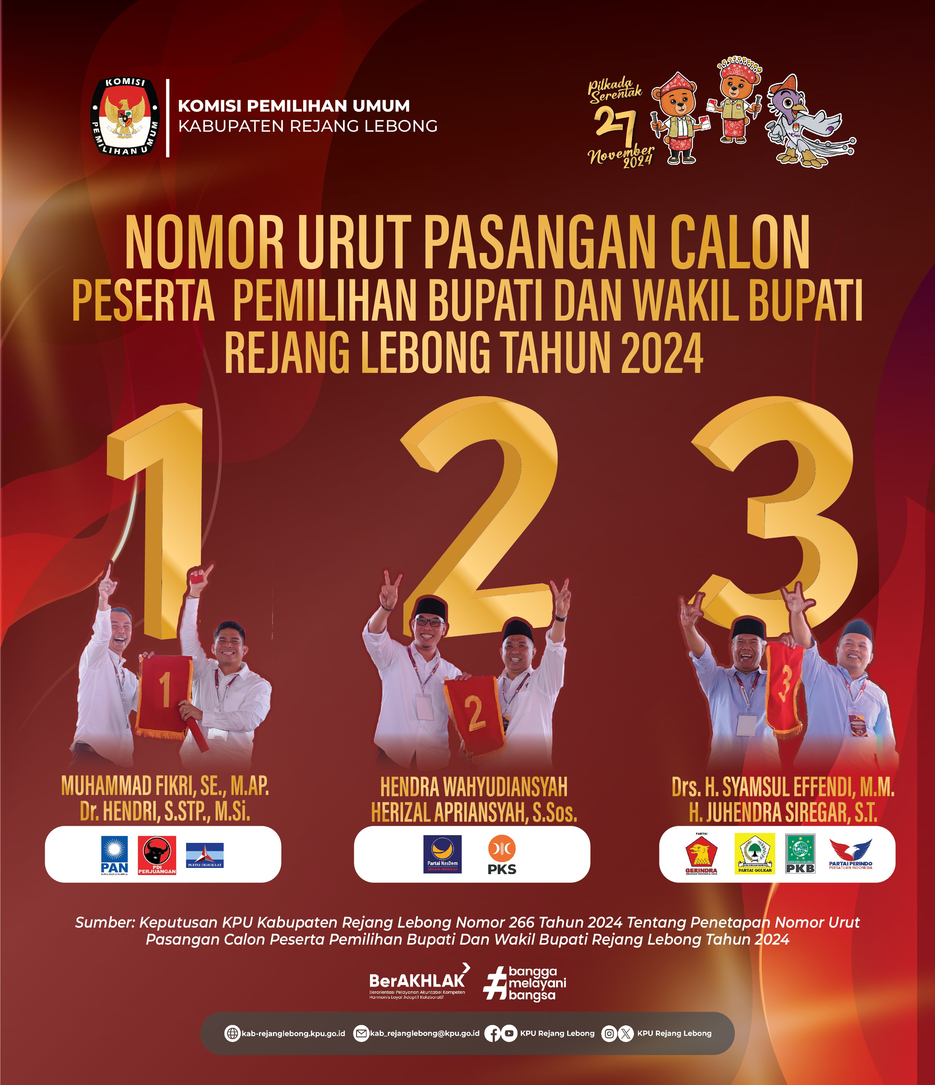 #TemanPemilih, Inilah Nomor Urut Pasangan Calon Peserta Pemilihan Bupati dan Wakil Bupati Rejang Lebong Tahun 2024.