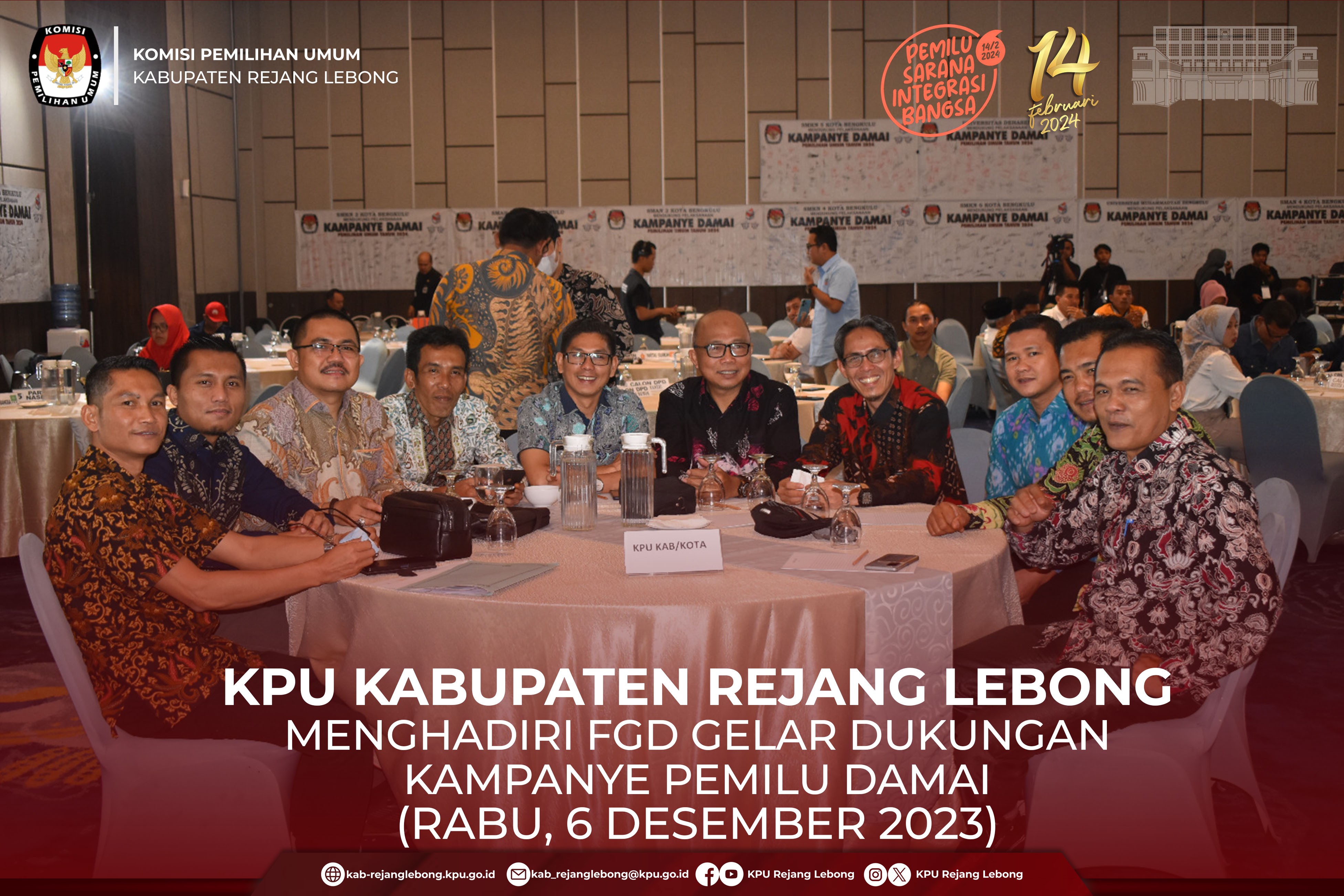 #TemanPemilih, Ketua KPU Kabupaten Rejang Lebong Ujang Maman dan Anggota KPU Kabupaten Rejang Lebong Buyono menghadiri Focus Disccusion Group (FGD) yang bertema Gelar Dukungan Kampanye Pemilu Damai, Wujudkan Pemilu Sebagai Sarana Integrasi Bangsa, Rabu (6/12/2023) di Hotel Mercure Bengkulu.