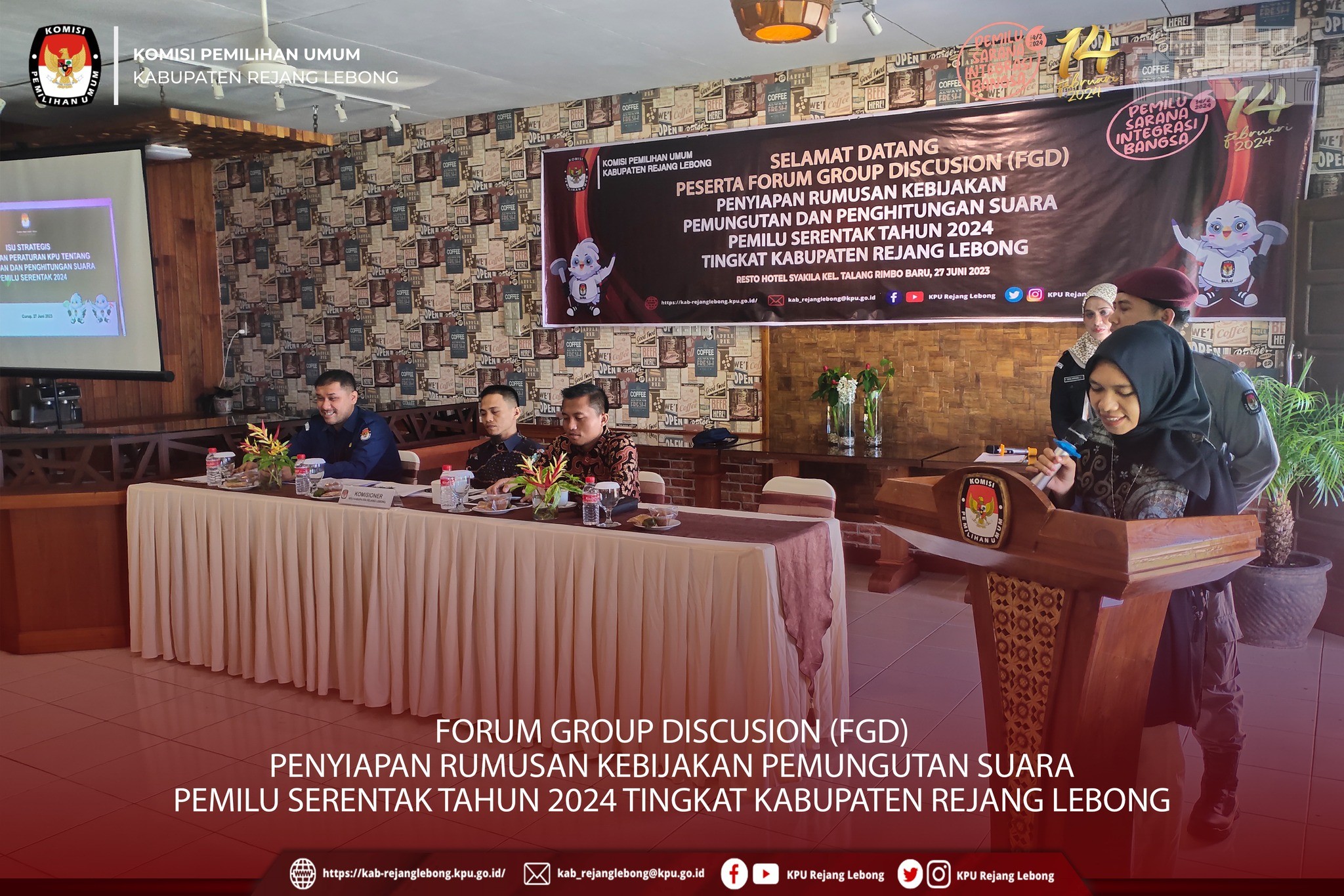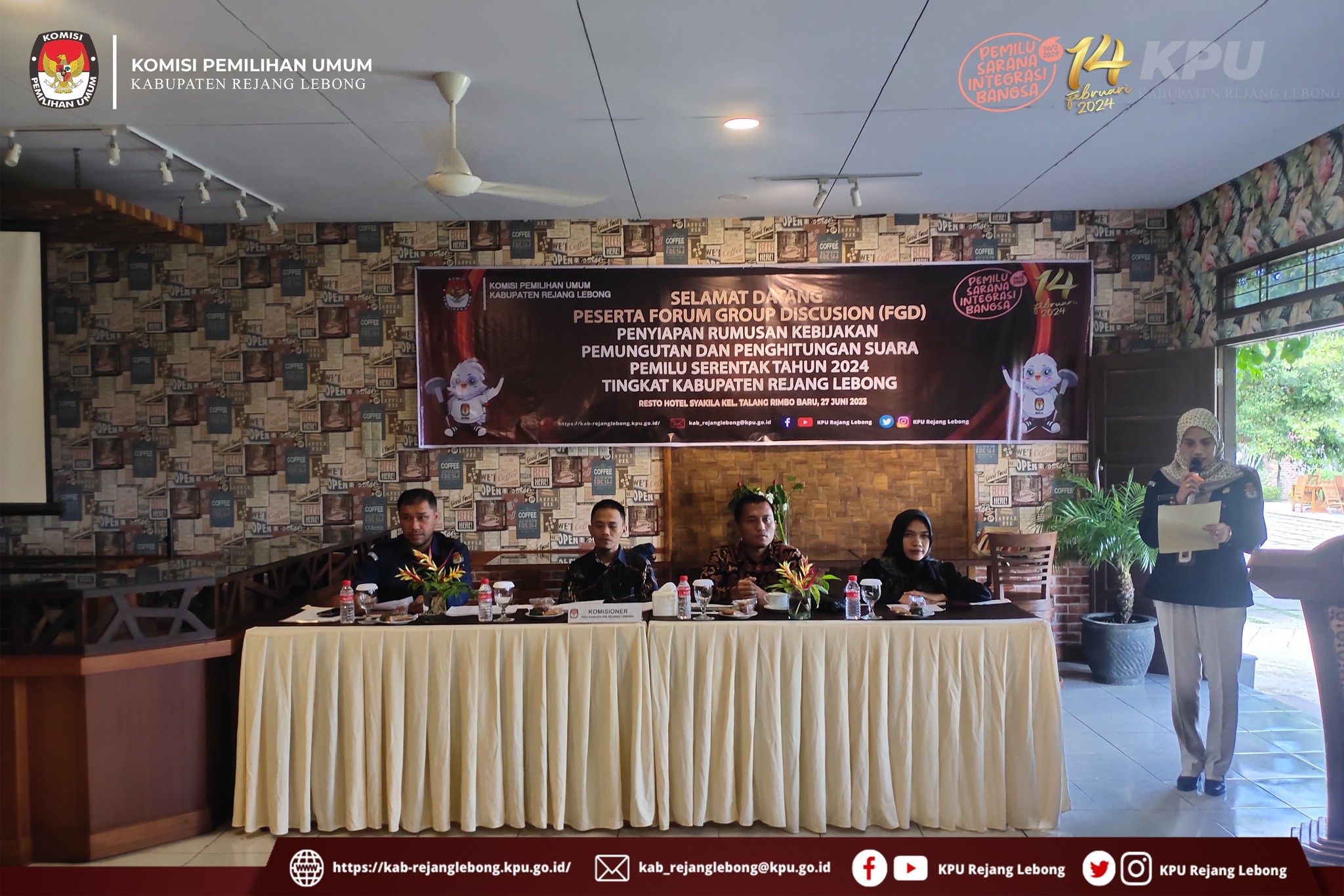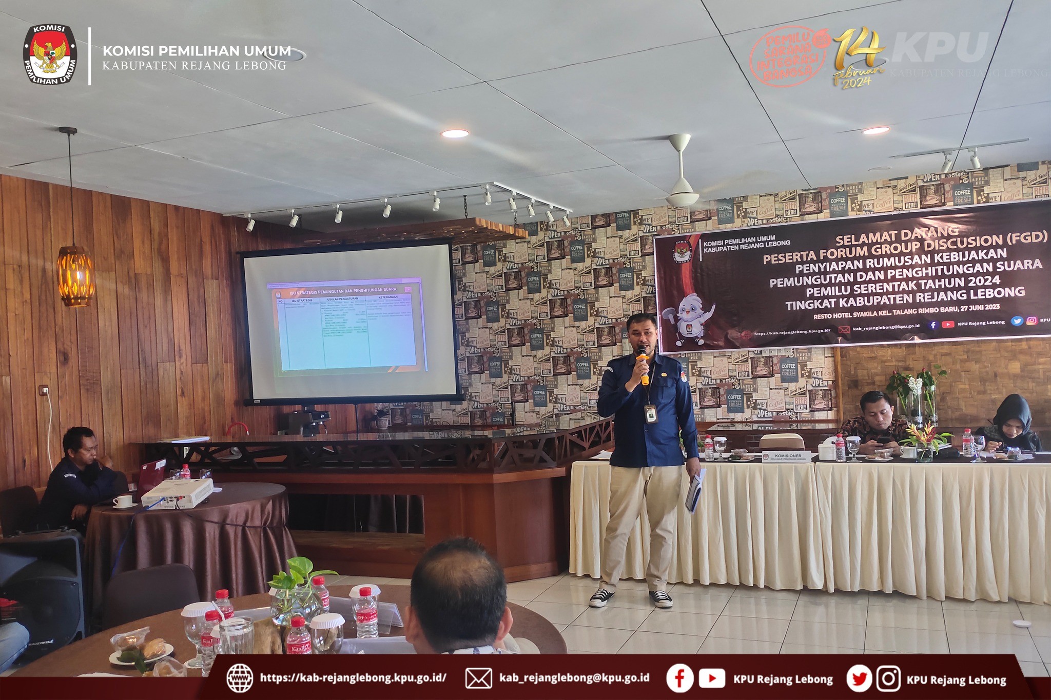 #TemanPemilih, KPU Kabupaten Rejang Lebong melaksanakan Forum Group Discusion (FGD) Penyiapan Rumusan Kebijakan Pemungutan dan penghitungan Suara Pemilu Serentak Tahun 2024 di Resto Hotel Syakila Curup, Selasa (27/06).