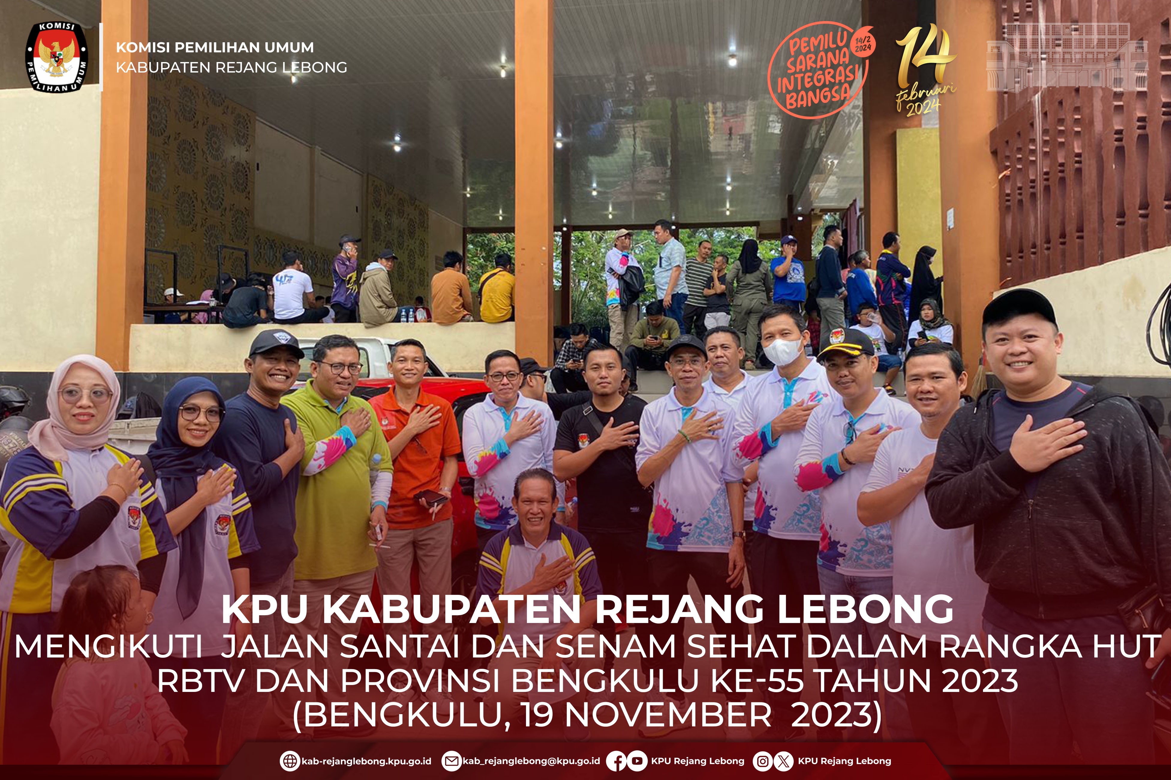 #TemanPemilih, KPU Kabupaten Rejang Lebong mengikuti kegiatan Jalan Santai dan Senam Sehat Dalam Rangka HUT RBTV dan Provinsi Bengkulu ke-55 Tahun 2023 di Lapangan Merdeka Bengkulu, Minggu (19/11) Pagi.
