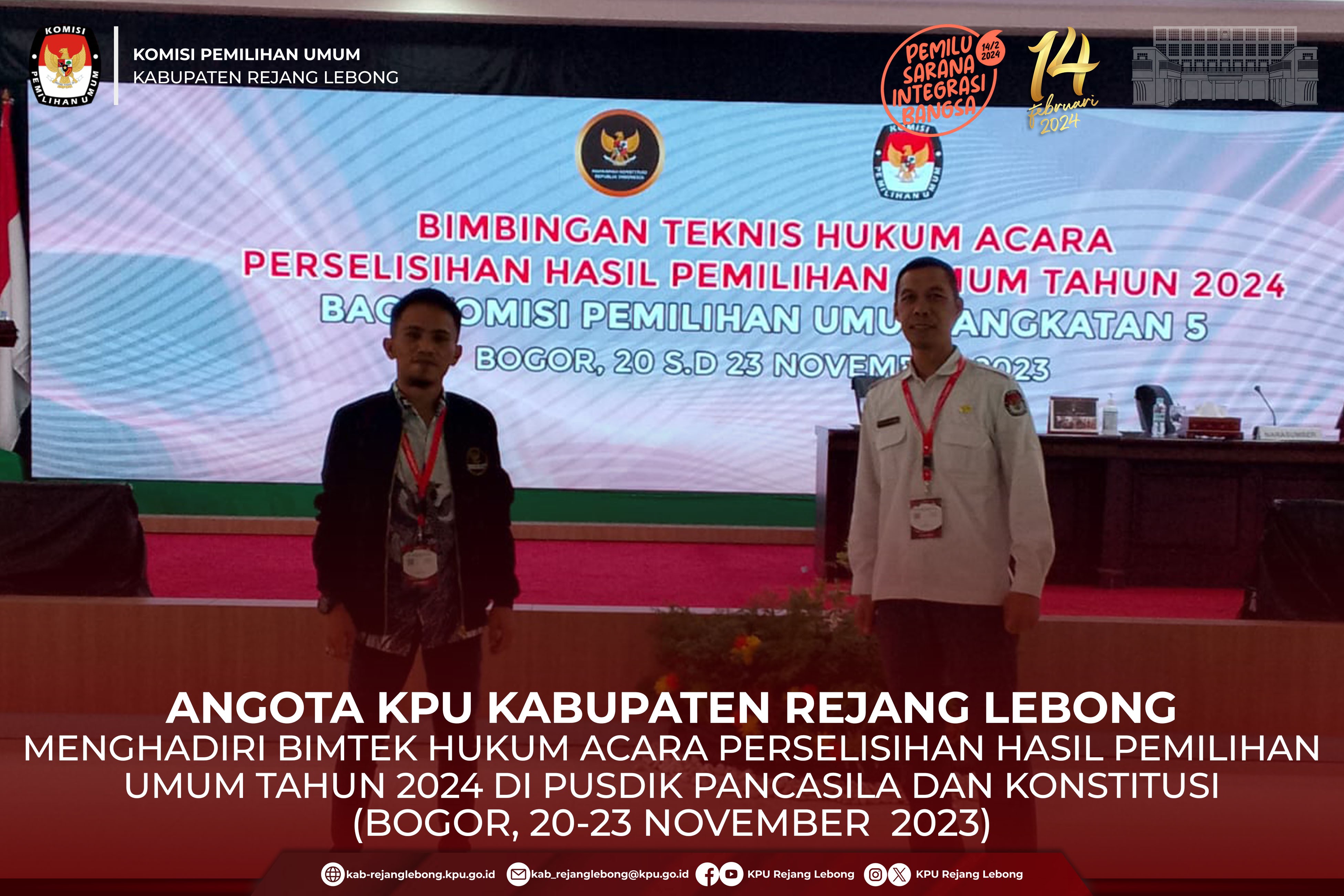 #TemanPemilih, Anggota KPU Kabupaten Rejang Lebong Divisi Hukum dan Pengawasan Ferdiansyah bersama Kasubbag Hukum dan SDM Noperi Ikhsan mengikuti kegiatan Bimtek Hukum Acara Perselisihan Hasil Pemilihan Umum Tahun 2024 Bagi Komisi Pemilihan Umum, Bogor, 20-23 November 2023