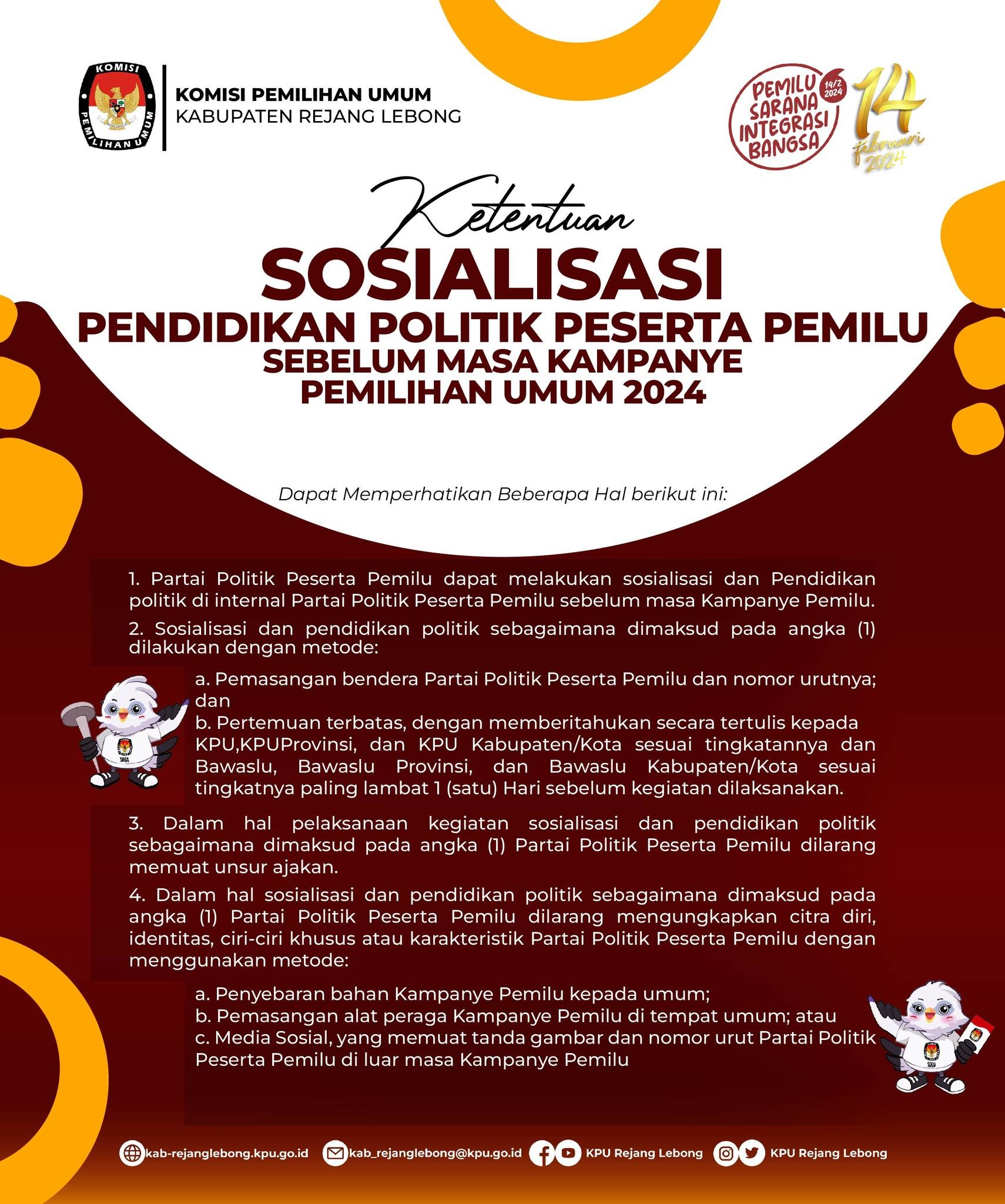 Mohon disimak #TemanPemilih, Berikut KPU Kabupaten Rejang Lebong menyampaikan Ketentuan Sosialisasi pendidikan peserta Pemilu sebelum masa kampanye Pemilihan umum tahun 2024.