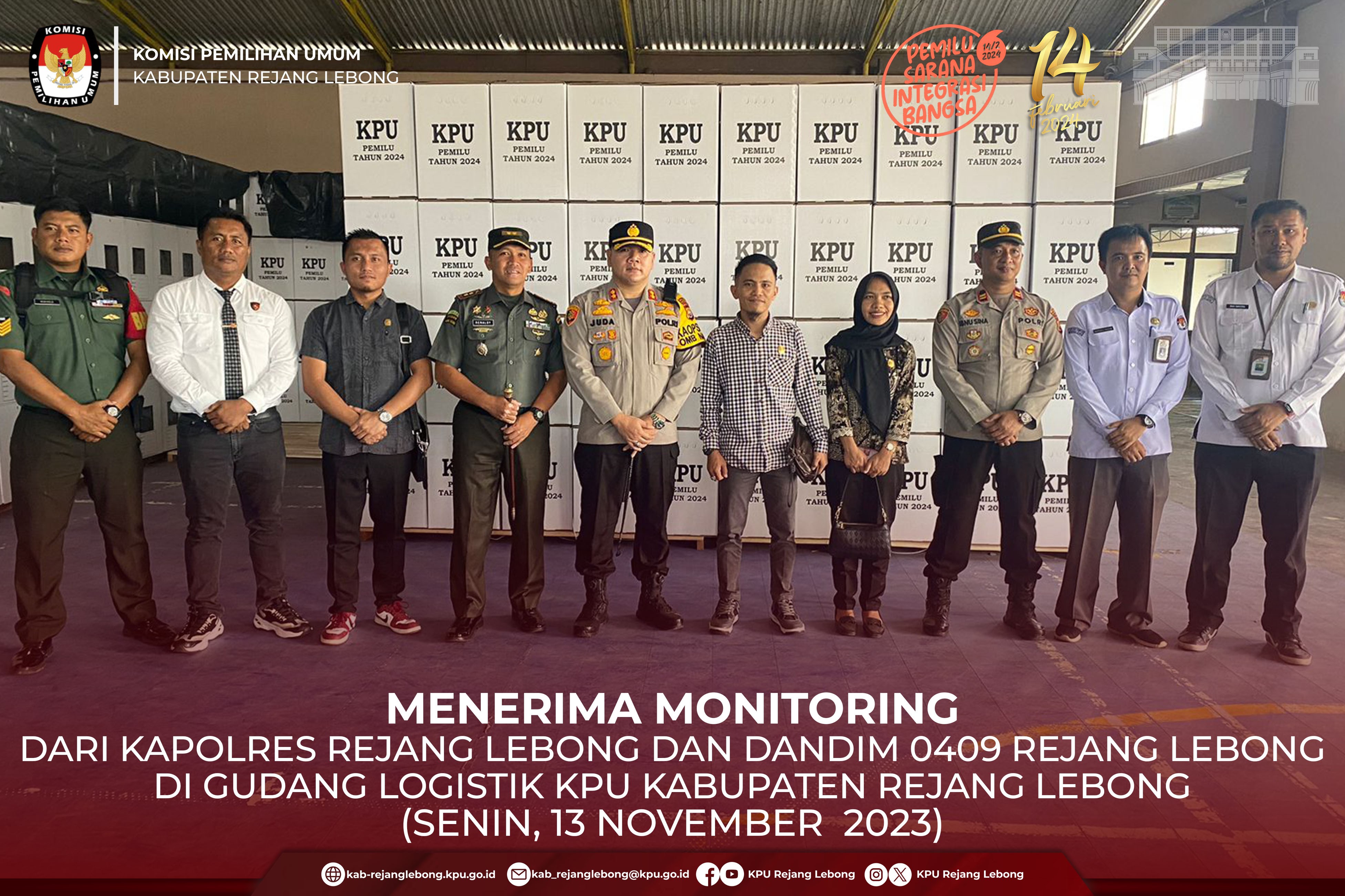 #TemanPemilih, KPU Kabupaten Rejang Lebong Menerima Monitoring dari Kapolres Rejang Lebong AKBP Juda Trisno Tampubolon, S.H, S.I.K, M.H dan Dandim 0409 Rejang Lebong Letkol INF Moch Renaldy, S.Sos., M.Si dalam memantau kesiapan logistik menjelang Pemilu tahun 2024 nanti di Gudang Logistik KPU Kabupaten Rejang Lebong gedung Adam Futsal Curup Tengah, Senin (13/11) siang.
