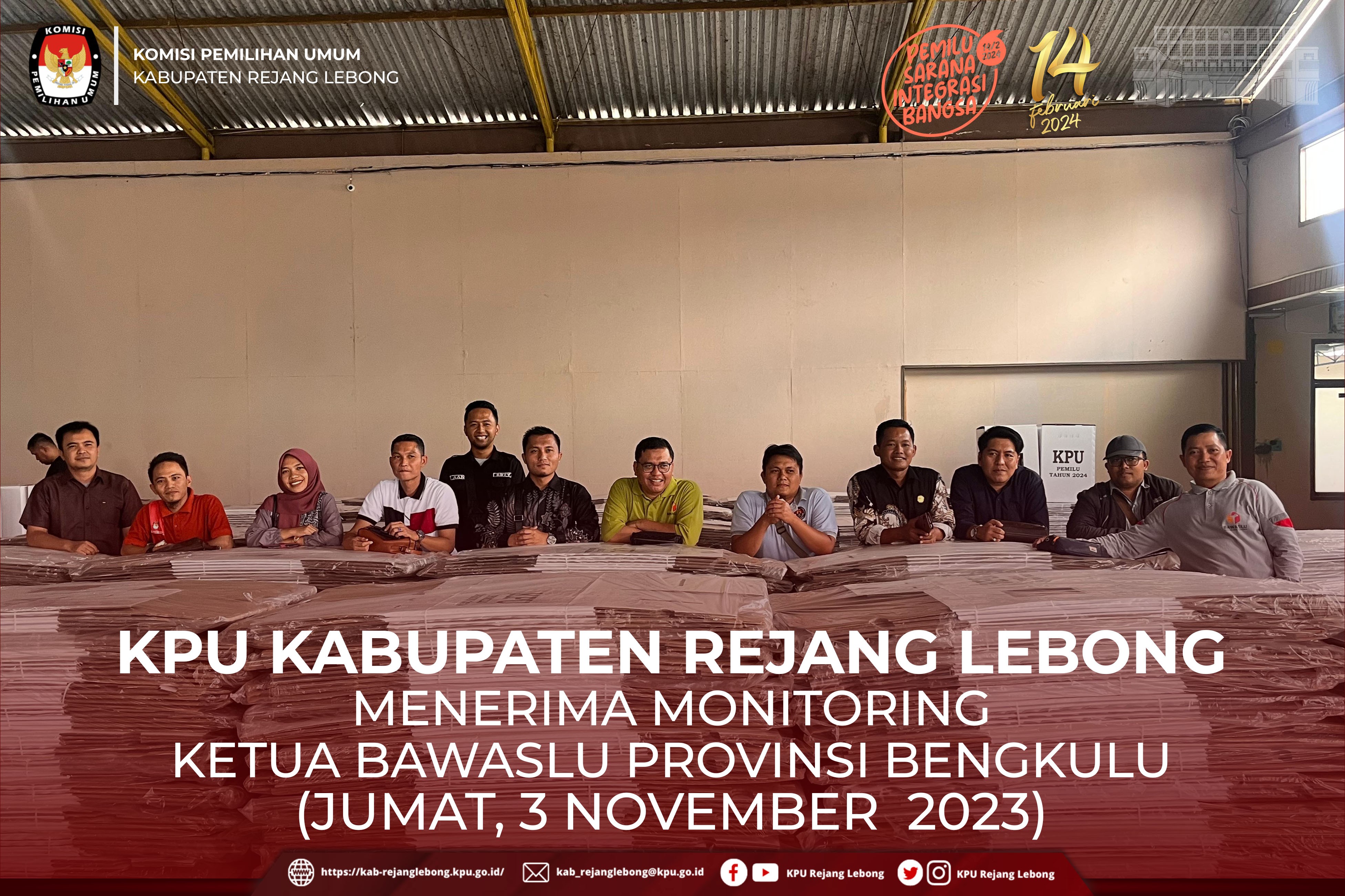 Kunjungan tersebut disambut langsung oleh Ketua KPU Kabupaten Rejang Lebong Ujang Maman beserta Anggota. Kunjungan ini merupakan Monitoring dilingkungan Bawaslu dalam Meninjau kesiapan logistik yang akan digunakan dalam Pemilu tahun 2024 mendatang.