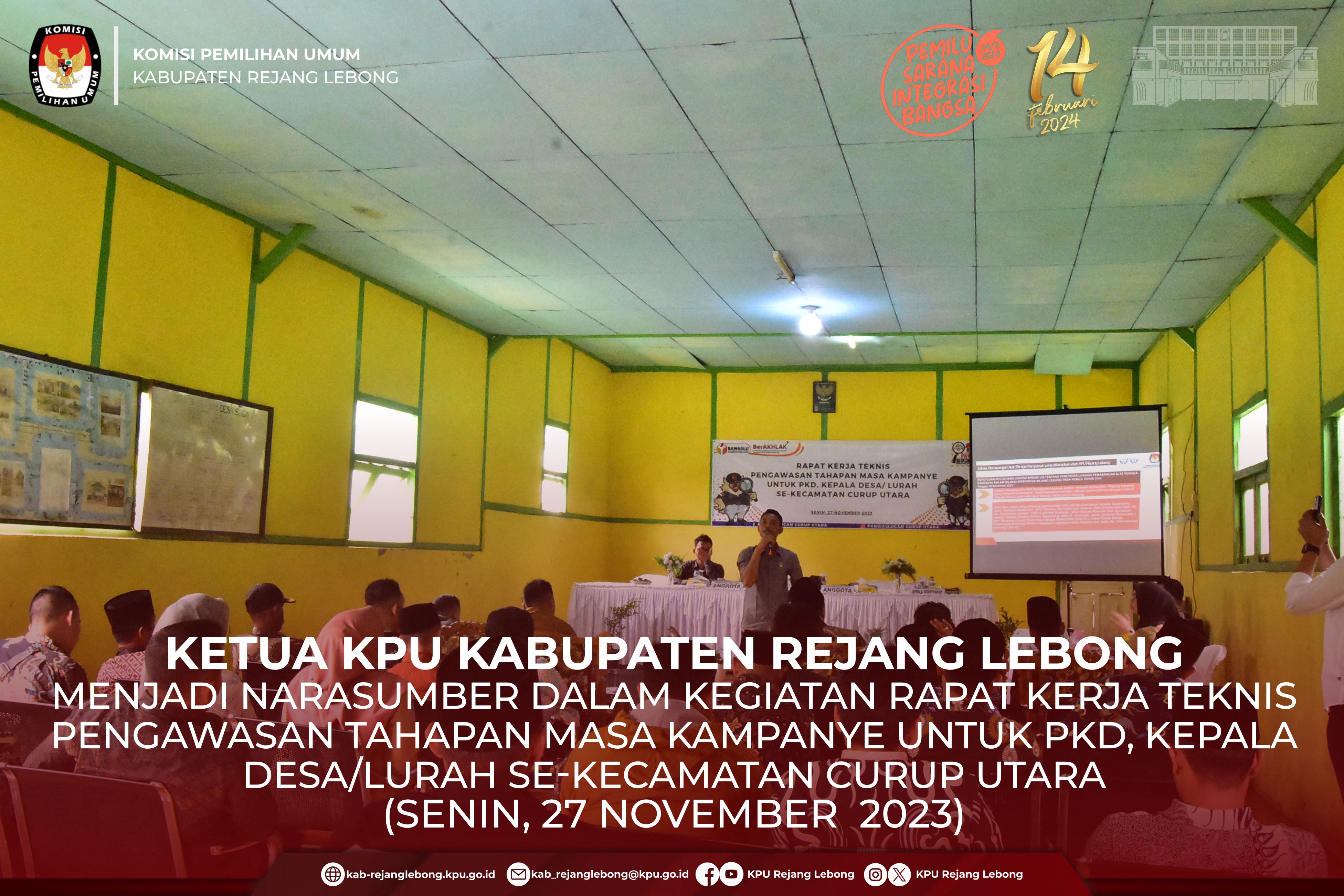 #TemanPemilih, Ketua KPU Kabupaten Rejang Lebong Ujang Maman menjadi salah satu Narasumber dalam Kegiatan Rapat Kerja Teknis Pengawasan Tahapan Masa Kampanye untuk PKD, Kepala Desa/Lurah se-Kecamatan Curup Utara yang diselenggarakan oleh Panwascam Curup Utara, Senin (27/11) Pagi.