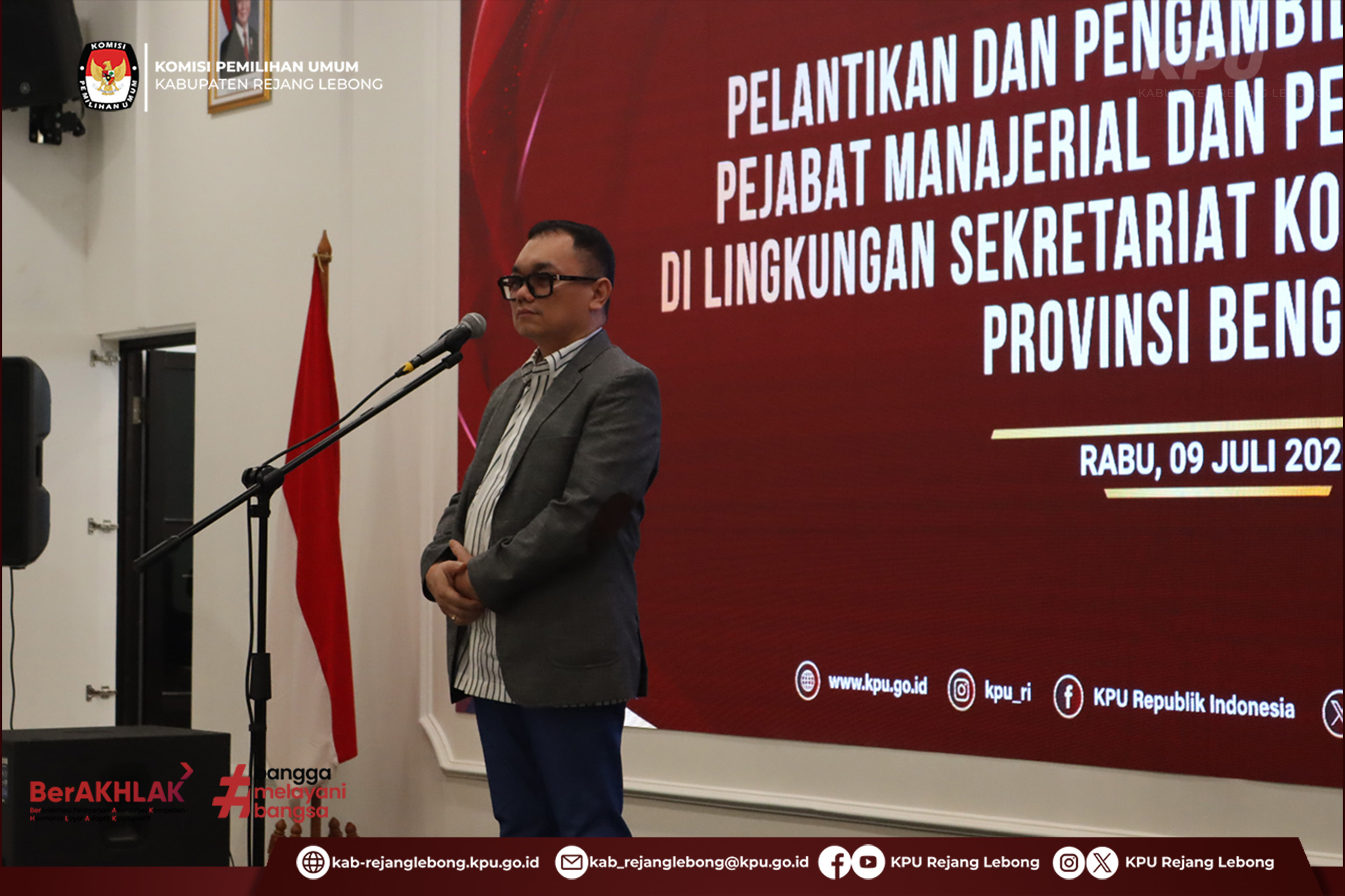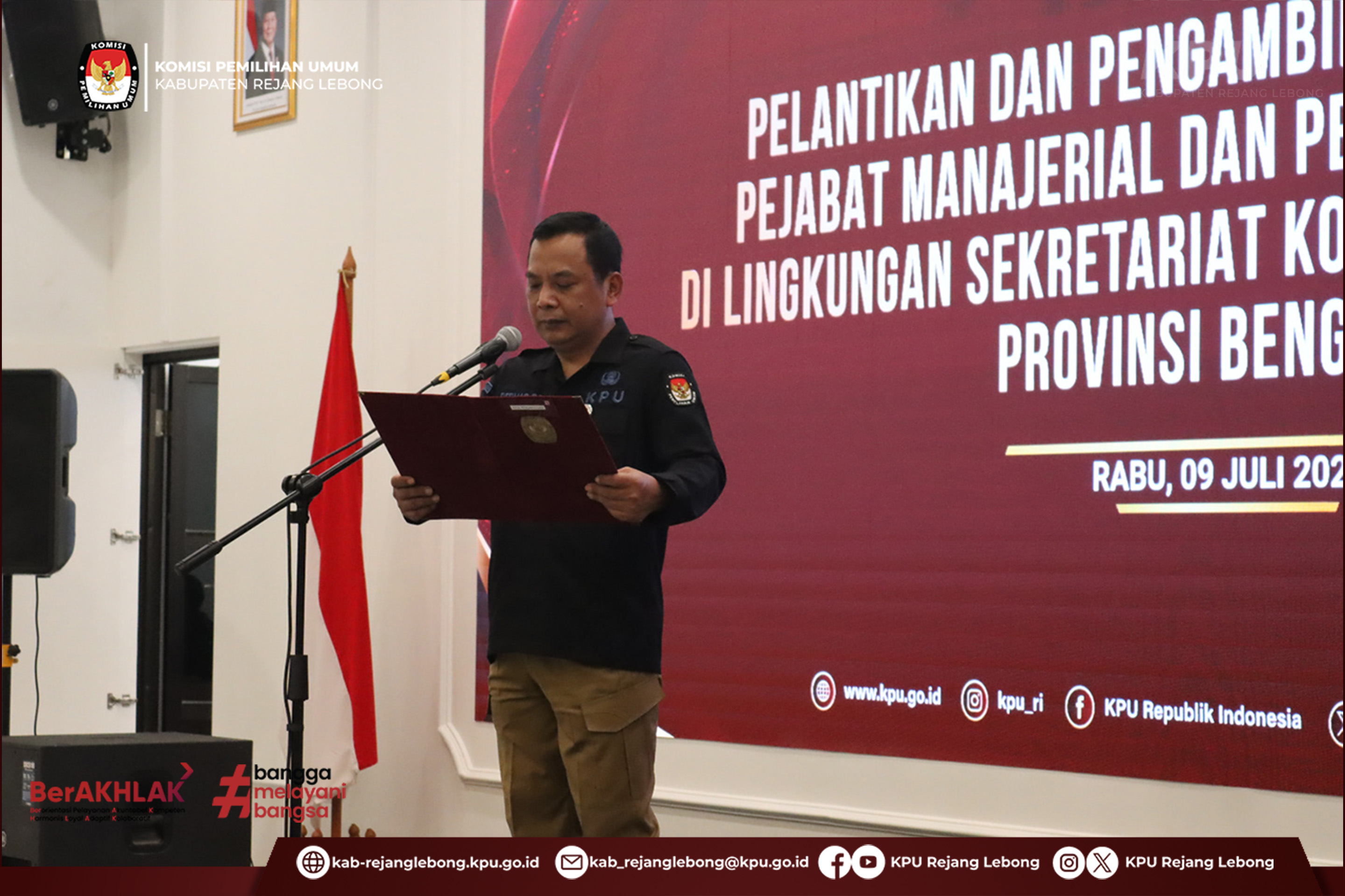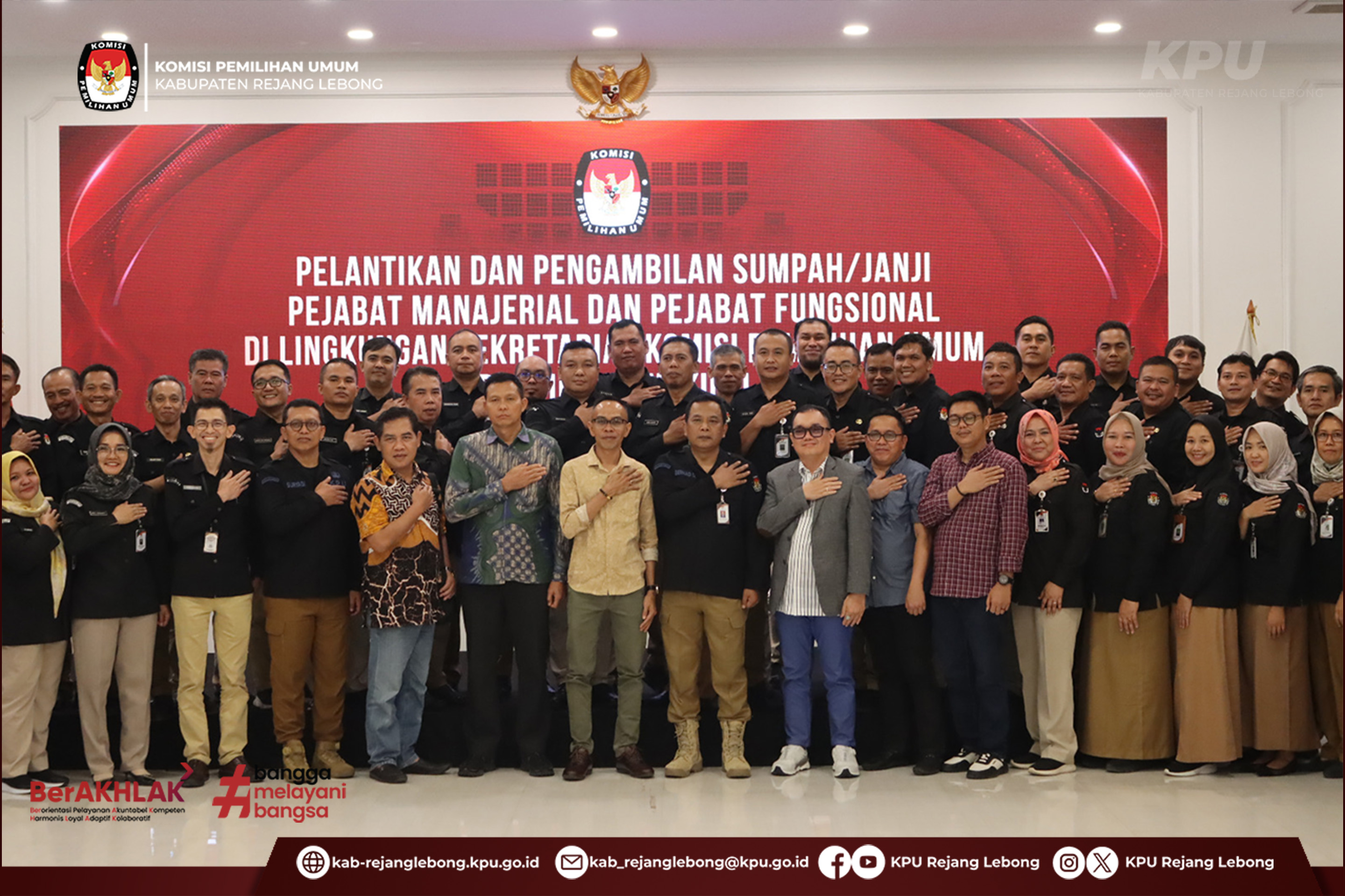 #TemanPemilih, KPU Kabupaten Rejang Lebong yakni Sekretaris beserta Jajaran Kasubbag hadir dalam Pelantikan dan Pengambilan Sumpah/Janji Pejabat Manajerial dan Pejabat Fungsional di Lingkungan Sekretariat Komisi Pemilihan Umum Provinsi Bengkulu di Kantor KPU Provinsi Bengkulu pada Rabu, (9/7/2025)