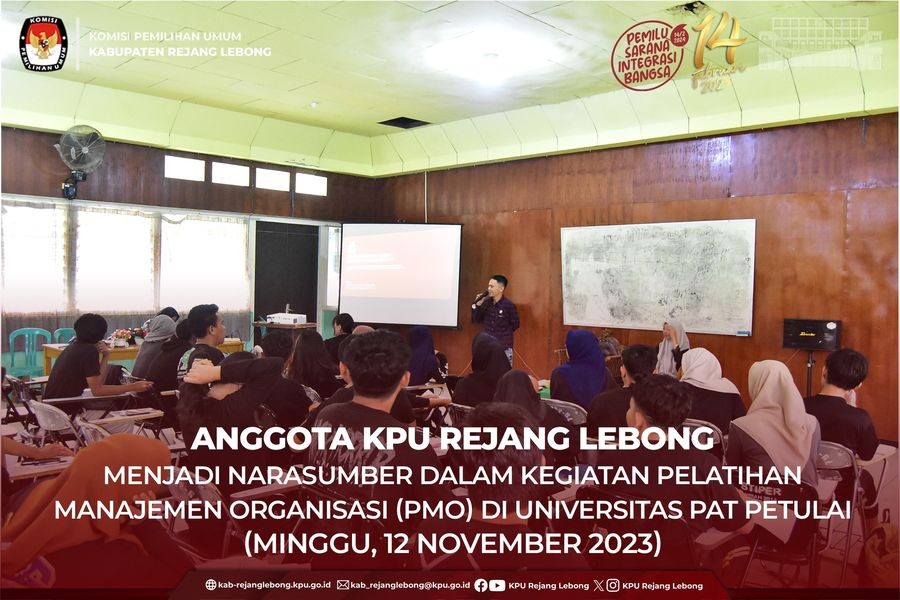 #TemanPemilih, Anggota KPU Kabupaten Rejang Lebong Divisi Hukum dan Pengawasan Ferdiansyah menjadi Narasumber membahas tentang pendidikan demokrasi dan kepemiluan di kabupaten rejang lebong dalam kegiatan Pelatihan Managemen Organisisasi di Universitas Pat Petulai (UPP) Rejang Lebong, Minggu (12/11) Pagi