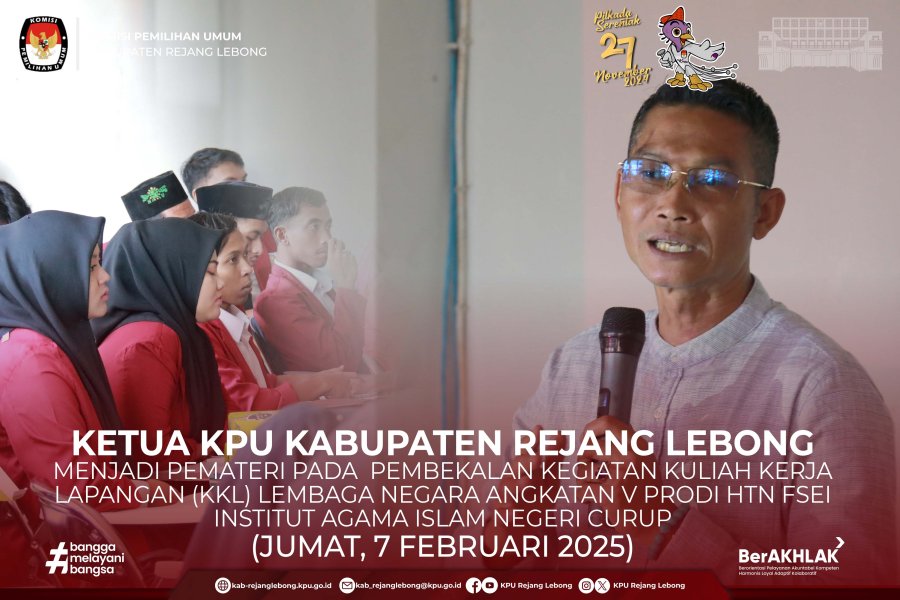 #TemanPemilih, Ketua KPU Kabupaten Rejang Lebong Ujang Maman Menjadi Pemateri pada Pembekalan Kegiatan Kuliah Kerja Lapangan (KKL) Lembaga Negara Angkatan V yang diadakan oleh Prodi Hukum Tata Negara Fakultas Syariah dan Ekonomi Islam Institut Agama Islam Negeri Curup Tahun 2025. Jumat (7/2)