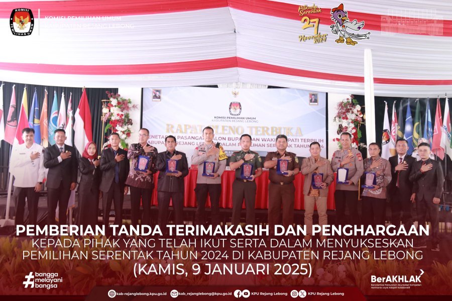 #TemanPemilih, KPU Kabupaten Rejang Lebong Memberikan Ucapan Terimakasih dan Piagam Penghargaan kepada seluruh pihak yang telah ikut serta dalam menyukseskan Pemilihan Serentak Tahun 2024 di Kabupaten Rejang Lebong, Kamis (9/1) siang