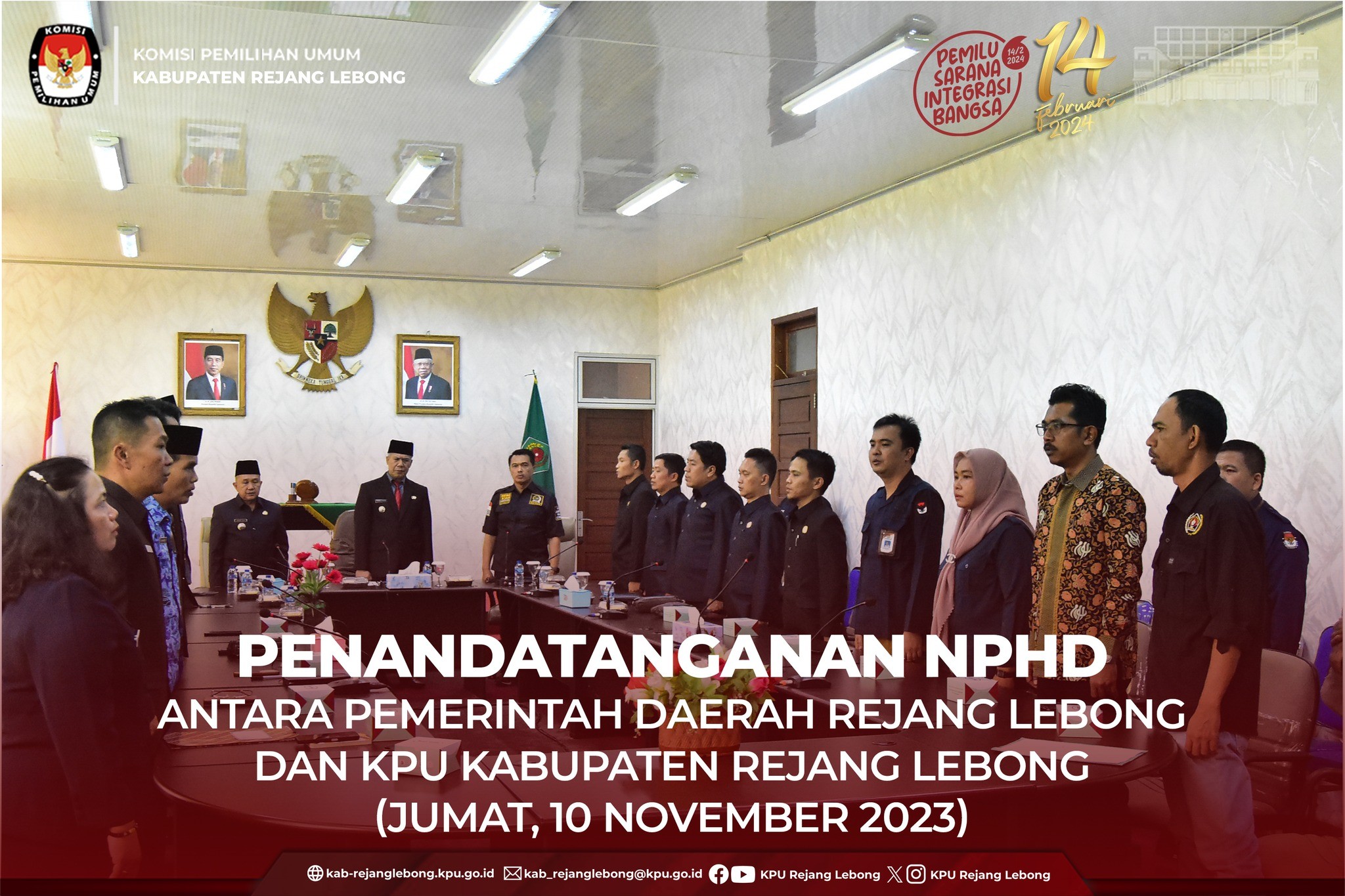 #TemanPemilih, Bupati Rejang Lebong Drs. H. Syamsul Effendi , MM dan Ketua KPU Kabupaten Rejang Lebong mendatangani Naskah Perjanjian Hibah Daerah dalam rangka menghadapi PILKADA Tahun 2024, acara berlangsung di ruang rapat Bupati Pemerintah daerah Kabupaten Rejang Lebong, yang disaksikan oleh Ketua DPRD Kabupaten Rejang Lebong, Sekda, Bapeda, BPKD, KesbangPol Pemda Kabupaten Rejang Lebong. Jumat (10/11) Siang