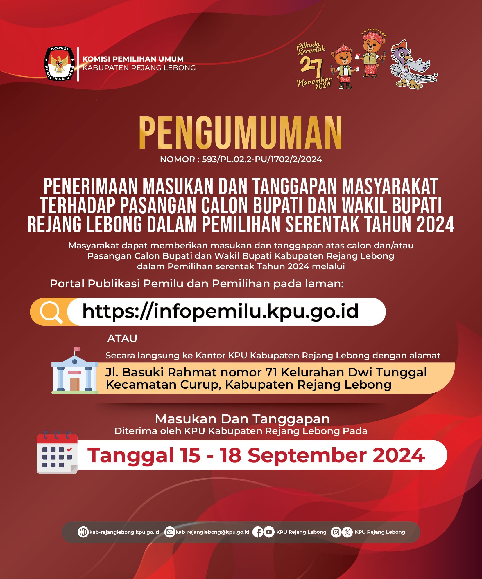 #TemanPemilih, Berikut KPU kabupaten Rejang Lebong Menyampaikan Pengumuman NOMOR : 593/PL.02.2-PU/1702/2/2024 TENTANG PENERIMAAN MASUKAN DAN TANGGAPAN MASYARAKAT PASANGAN CALON BUPATI DAN WAKIL BUPATI REJANG LEBONG DALAM PEMILIHAN SERENTAK TAHUN 2024