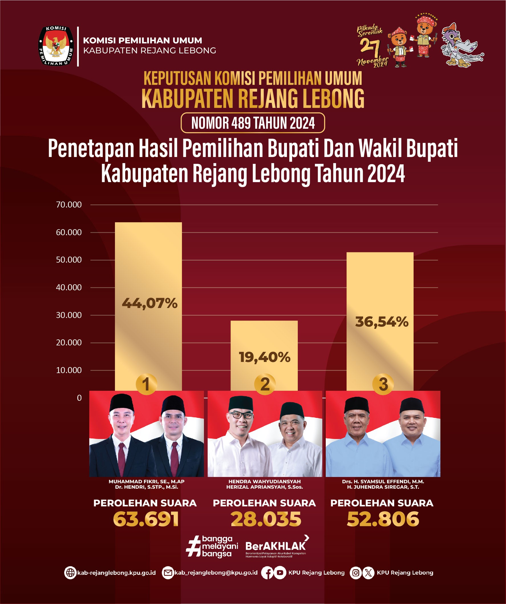 #TemanPemilih Berikut Infografis Penetapan Hasil Pemilihan Bupati dan Wakil Bupati Kabupaten Rejang Lebong Tahun 2024 bedasarkan Keputusan KPU Kabupaten Rejang Lebong Nomor 489 Tahun 2024.