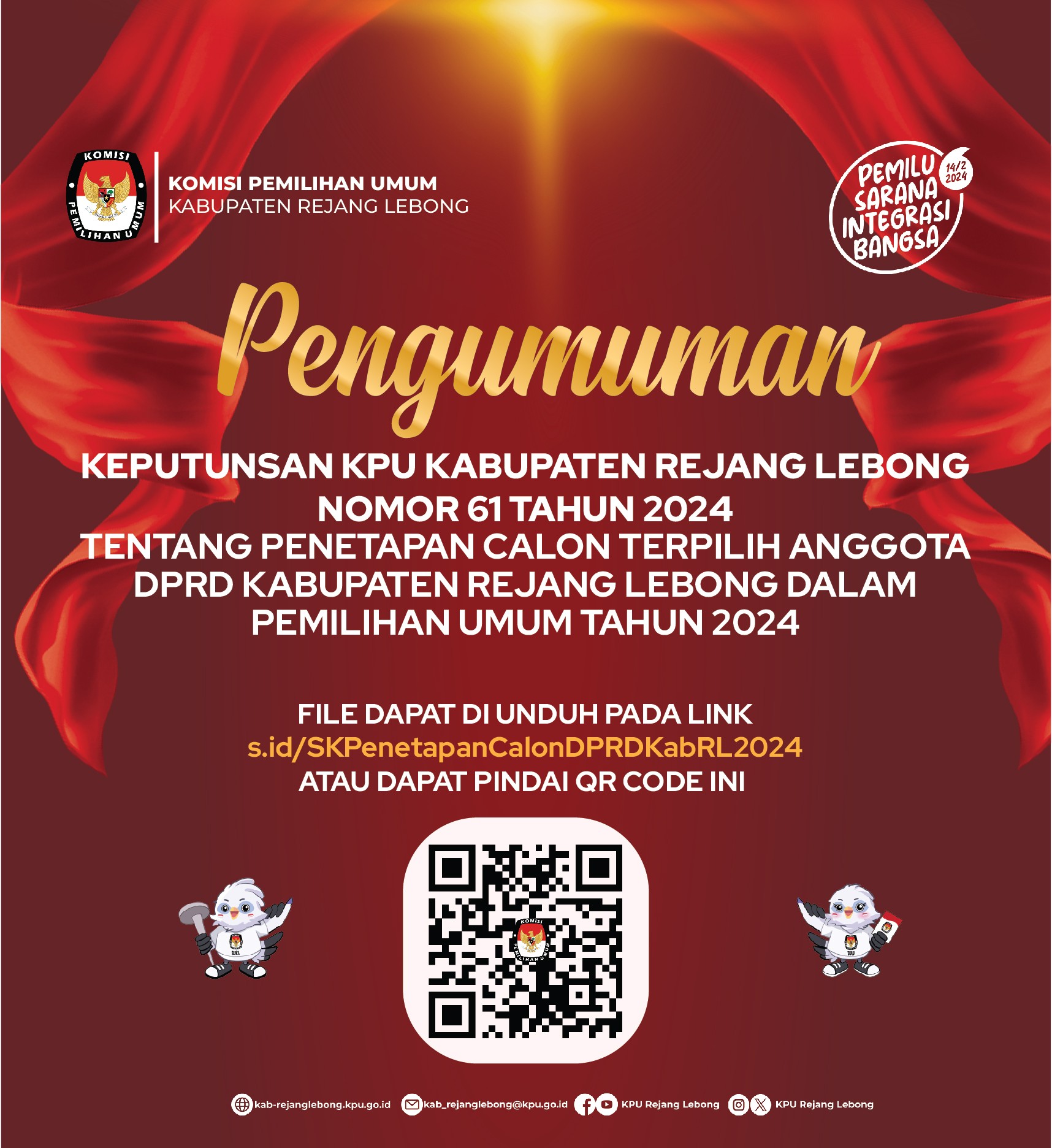 KPU Kabupaten Rejang Lebong Menerbitkan KEPUTUSAN KPU KABUPATEN LEBONG NOMOR 61 TAHUN 2024 ENTANG PENETAPAN CALON TERPILIH ANGGOTA DPRD KABUPATEN REJANG LEBONG DALAM PEMILIHAN UMUM TAHUN 2024
