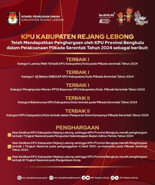 6. Penghargaan atas Dedikasi KPU Kabupaten Rejang Lebong, sehingga KPU Provinsi Bengkulu meraih penghargaan terbaik I Tingkat Nasional pada Penguatan Kelembagaan Badan Adhoc Pemilu Tahun 2024.