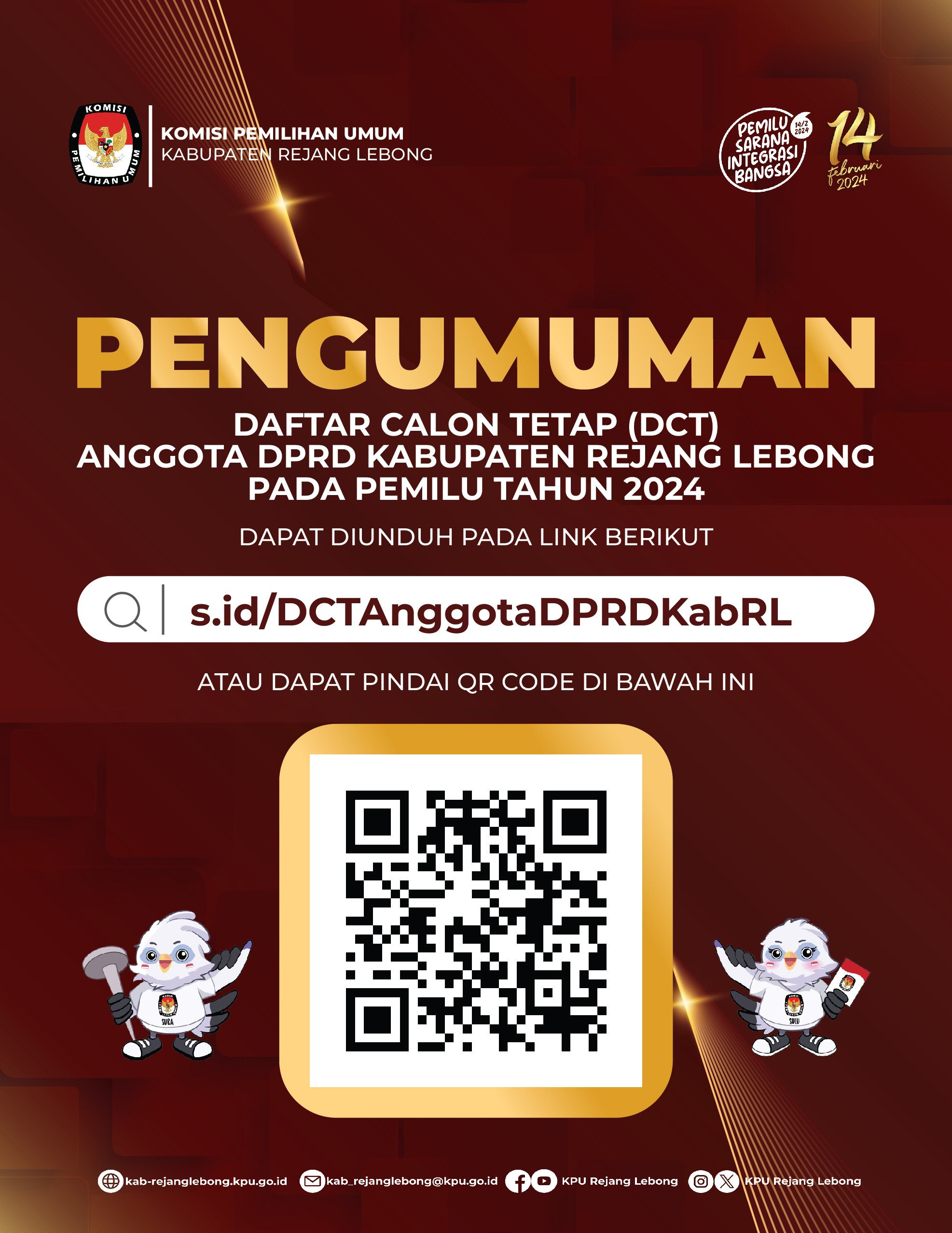 Berikut KPU Kabupaten Rejang Lebong menyampaikan pengumuman Daftar Calon Tetap (DCT) anggota DPRD Kabupaten Rejang Lebong untuk PEMILU Tahun 2024
