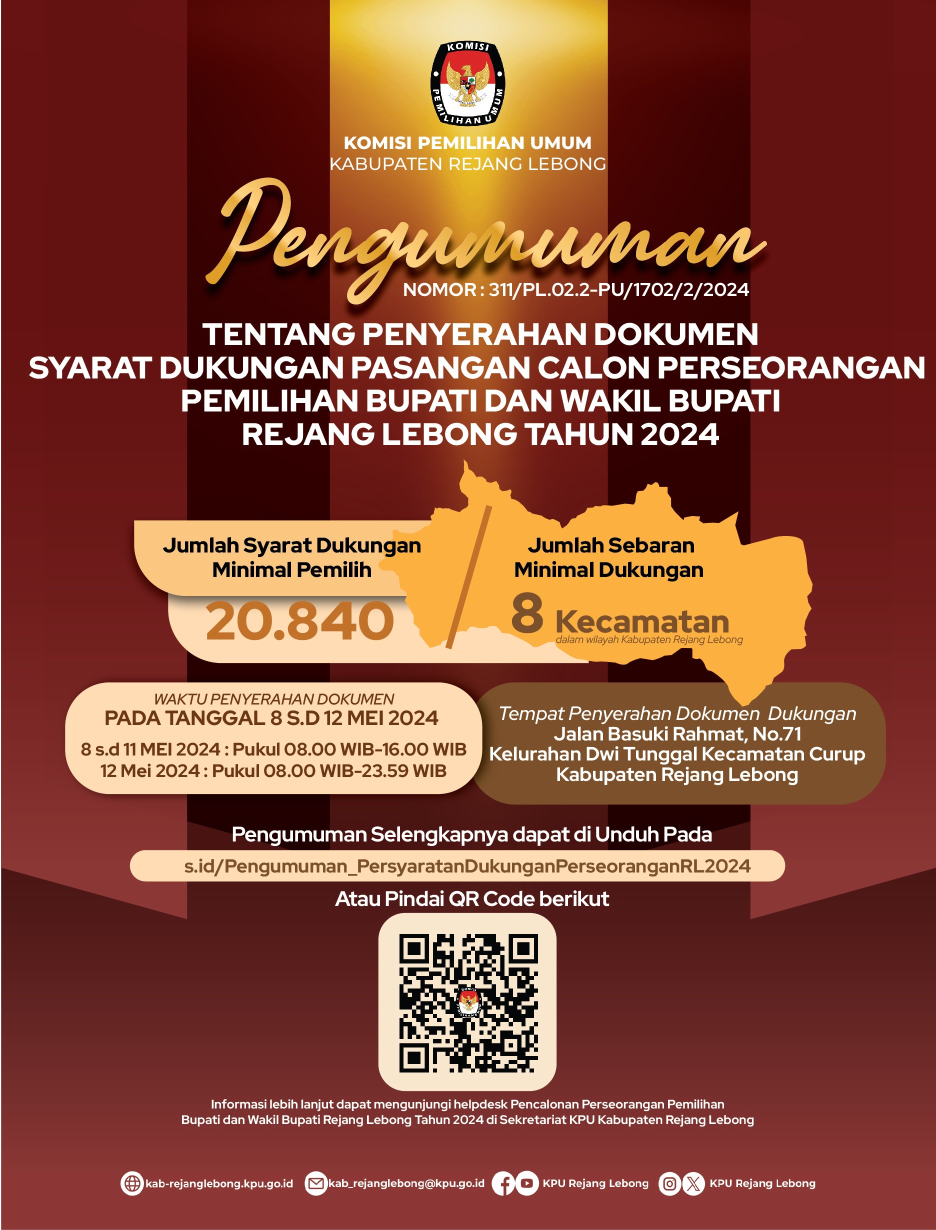 KPU KABUPATEN REJANG LEBONG MENGUMUMKAN TENTANG PENYERAHAN DOKUMEN SYARAT DUKUNGAN PASANGAN CALON PERSEORANGAN PEMILIHAN BUPATI DAN WAKIL BUPATI REJANG LEBONG TAHUN 2024
