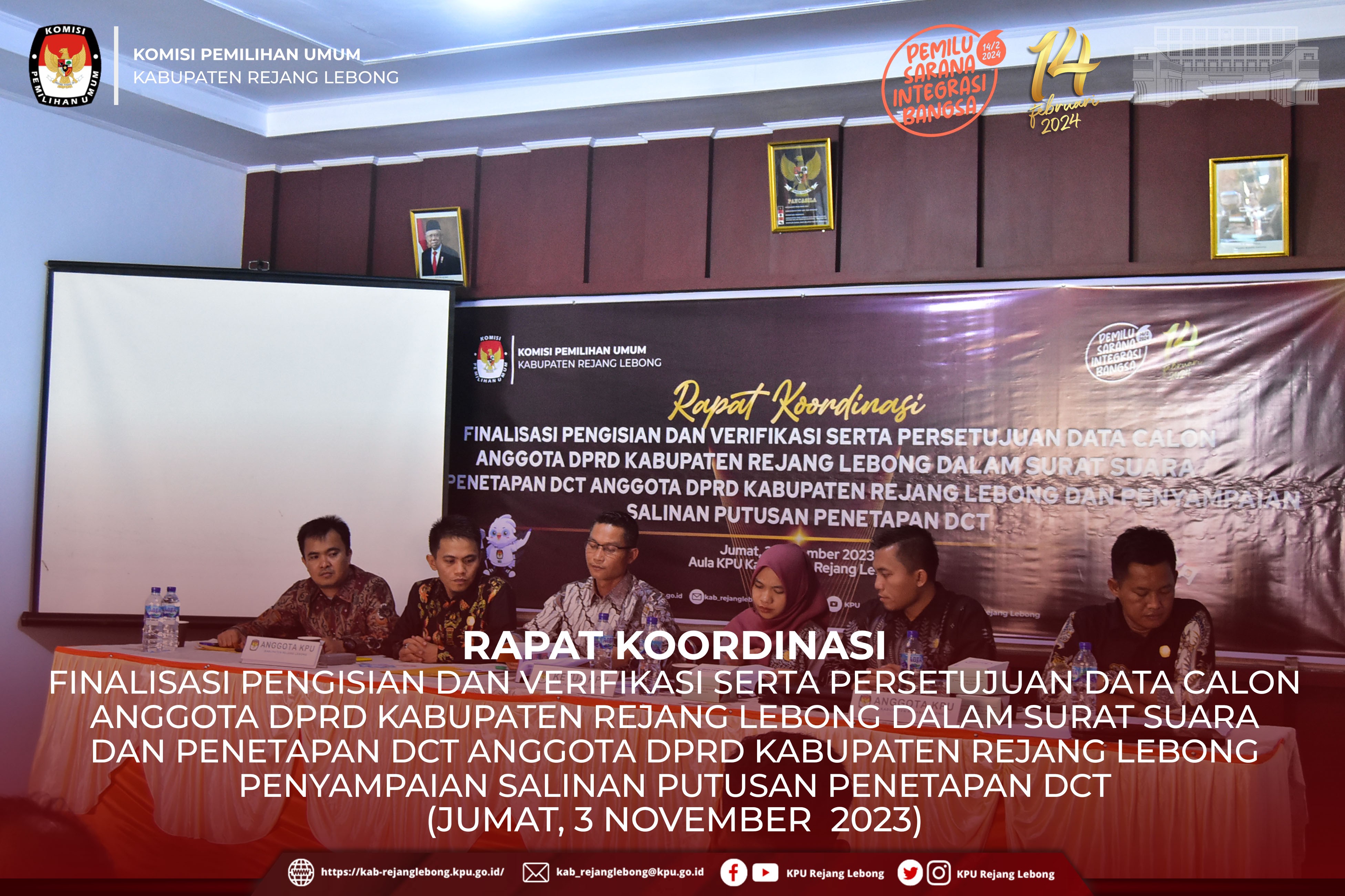 Rapat Koordinasi Finalisasi Pengisian dan Verifikasi serta Persetujuan data Calon Anggota DPRD Kabupaten Rejang Lebong dalam Surat Suara dan Penetapan DCT Anggota DPRD Kabupaten Rejang Lebong