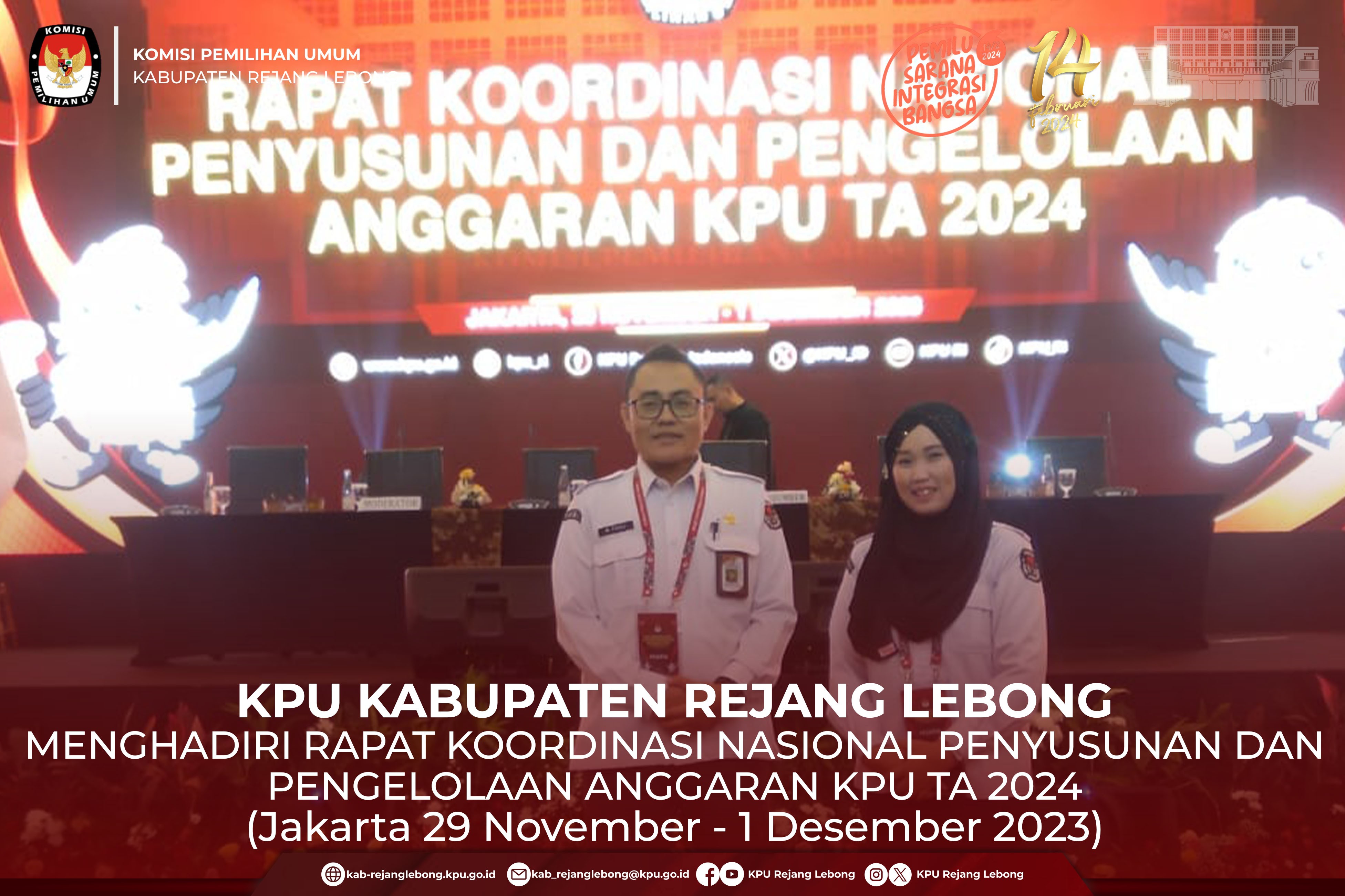 #TemanPemilih, KPU Kabupaten Rejang menghadiri Rapat Koordinasi Nasional Penyusunan dan Pengelolaan Anggaran KPU TA 2024 yang mana dalam hal ini di hadiri oleh Kasubbag Kasubbag Perencanaan Data dan Informasi Muhamad Fadli dan Operator SAKTI Winda Wulan Sari di Jakarta 29 November - 1 Desember 2023.