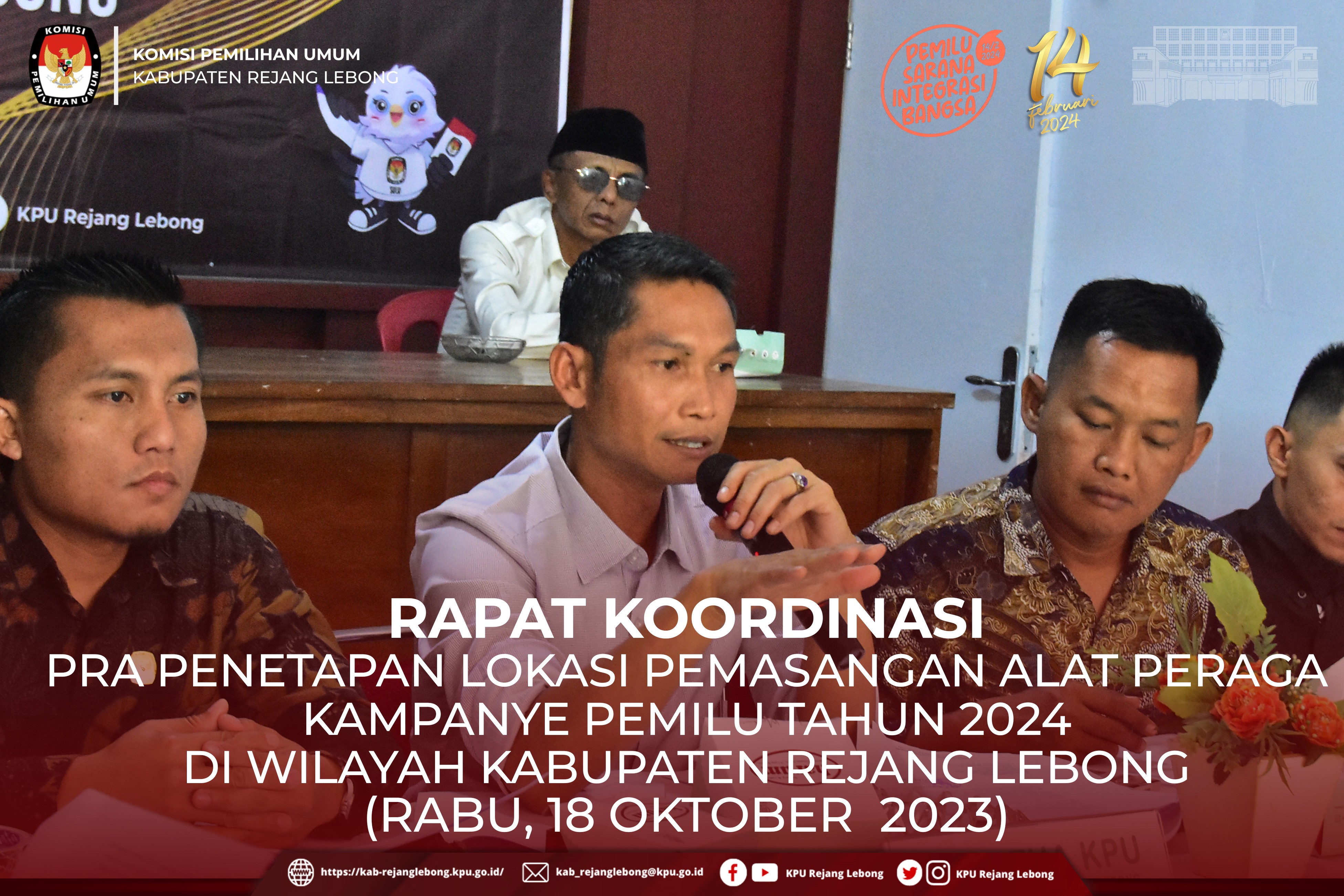Kegiatan Ini dilakukan guna mempersiapkan tahapan kampanye yang akan berlangsung dan mempersatukan pendapat bersama stakeholder yang terkait Penetapan lokasi Pemasangan Alat Peraga Kampanye pemilu tahun 2024 di Wilayah Kabupaten Rejang Lebong.