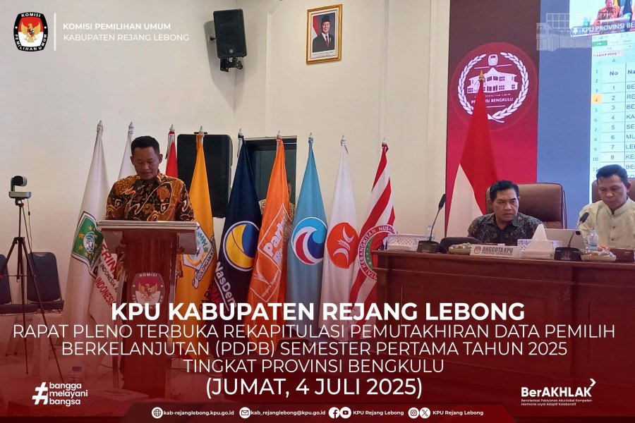 #TemanPemilih, Anggota KPU Kabupaten Rejang Lebong Muhammad Anas Kholiq bersama Admin Operator Sidalih KPU Kabupaten Rejang Lebong hadir dalam Rapat Pleno Terbuka Rekapitulasi Pemutakhiran Data Pemilih Berkelanjutan (PDPB) Semester Pertama Tahun 2025 Tingkat Provinsi Bengkulu bertempat di Aula Demokrasi KPU Provinsi Bengkulu, Kamis (4/7/2025).