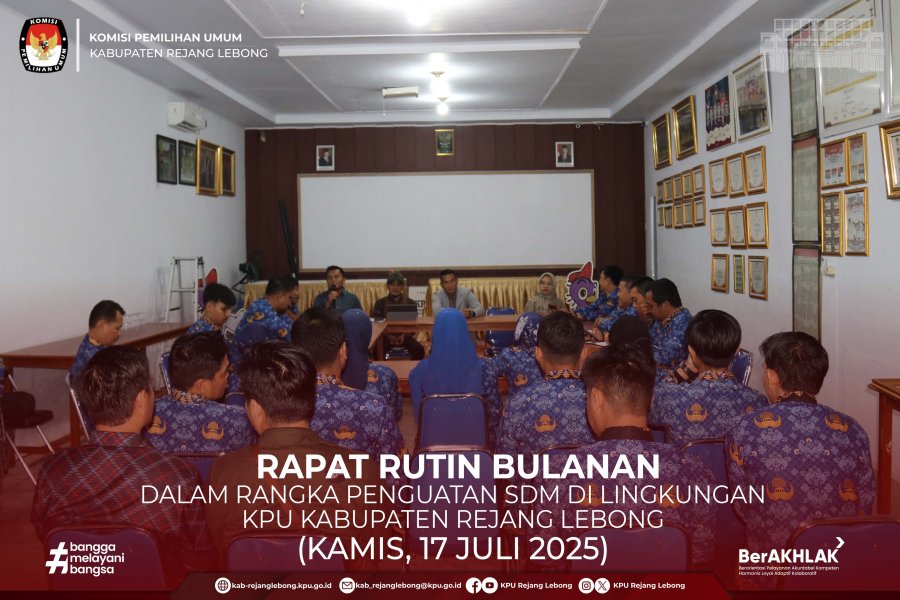 #TemanPemilih, KPU Kabupaten Rejang Lebong Melakukan Rapat Rutin Bulanan pada seluruh jajaran KPU Kabupaten Rejang Lebong di Aula KPU Kabupaten Rejang Lebong, Kamis (17/07/2025) Pagi.