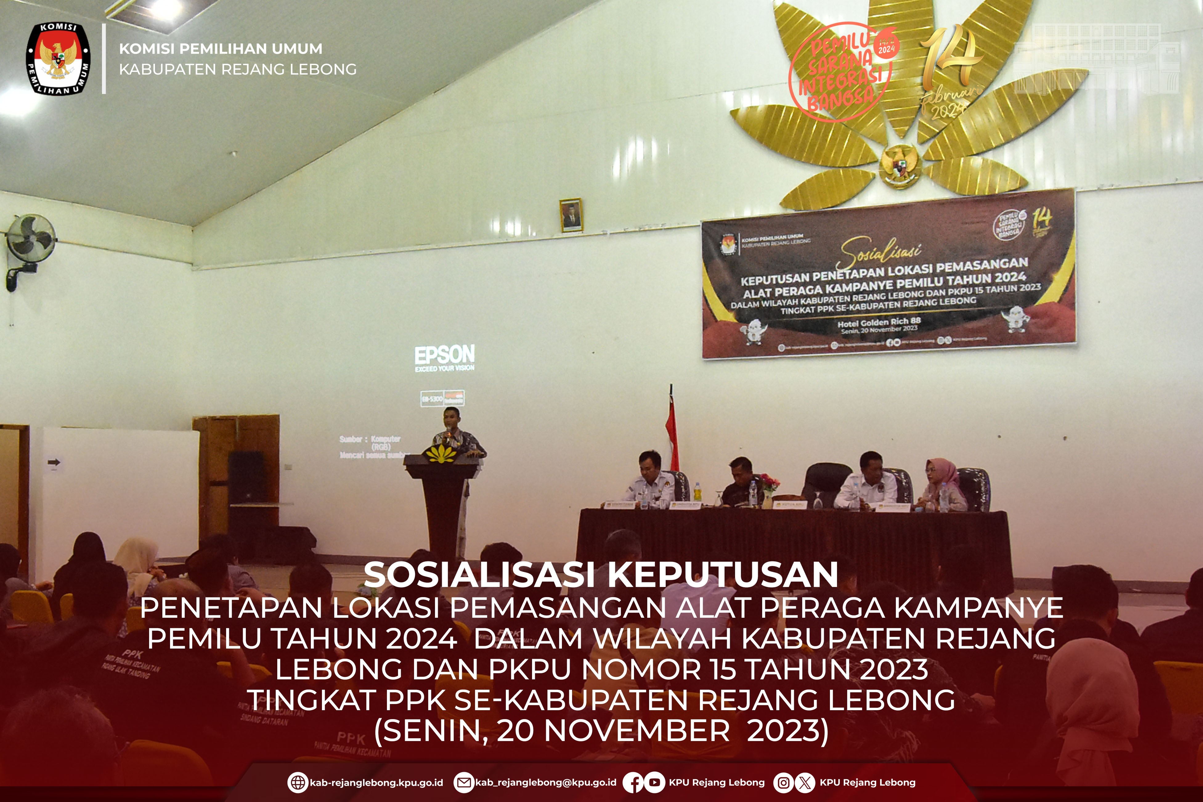 #TemanPemilih, KPU Kabupaten Rejang Lebong Mengadakan Sosialisasi Keputusan Penetapan lokasi Pemasangan Alat Peraga Kampanye Pemilu Tahun 2024 dalam Wilayah Kabupaten Rejang Lebong dan PKPU Nomor 15 Tahun 2023 Tingkat PPK se-Kabupaten Rejang Lebong, di Hotel Golden Rich 88, Senin (20/11) Siang.
