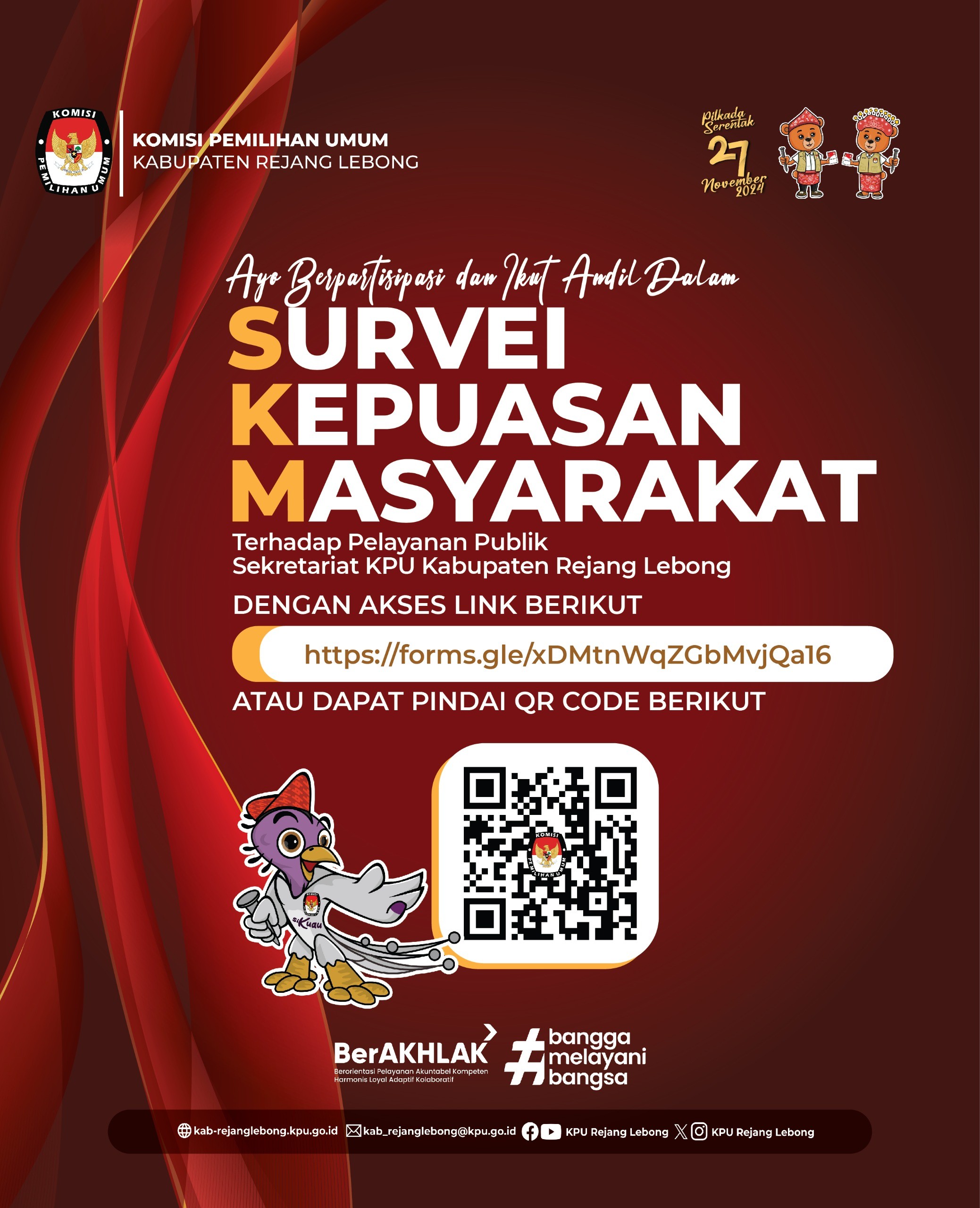 Hai #TemanPemilih, Ayo ikut andil dalam Survei Kepuasan Masyarakat Tahun 2024 dalam rangka perbaikan dan peningkatan kualitas pelayanan yang diberikan oleh Sekretariat KPU Kabupaten Rejang Lebong, dengan akses tautan link berikut :