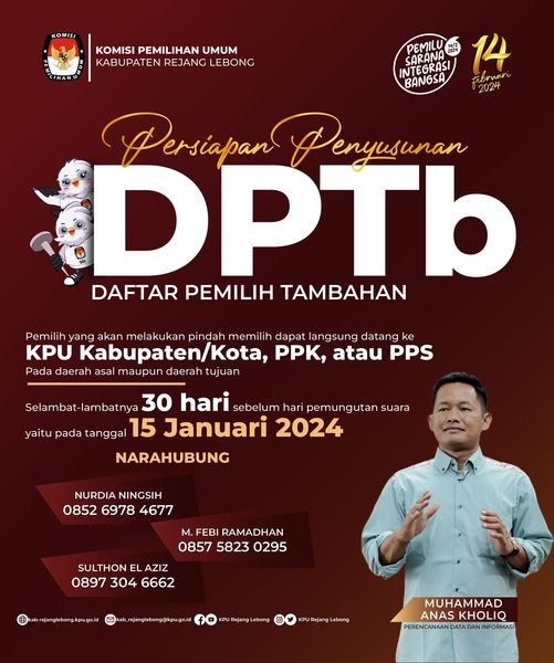 Hai #TemanPemilih Mempedomani PKPU No 7 Tahun 2023 tentang Perubahan atas PKPU No 7 Tahun 2022 tentang Penyusunan Daftar Pemilih dalam Penyelenggaraan Pemilihan Umum dan Sistem Informasi Data Pemilih serta keputusan KPU No 27 Tahun 2023 KPU kabupaten Rejang Lebong akan melaksanakan tahapan Penyusunan Daftar Pemilih Tambahan (DPTb).