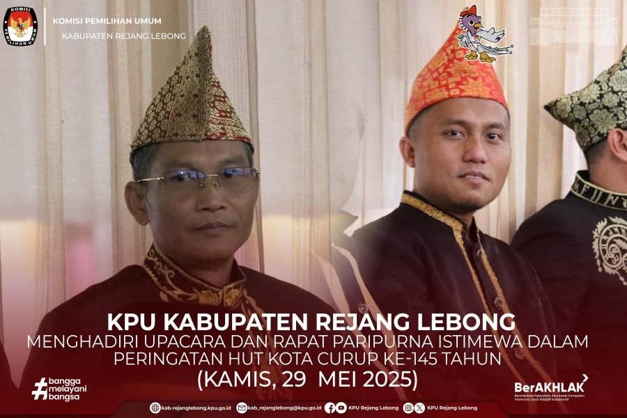 #TemanPemilih, Ketua KPU Kabupaten Rejang Lebong Ujang Maman beserta Anggota KPU Kabupaten Rejang Lebong Divisi Sosdiklih Parmas dan SDM Buyono, Hadir dalam kegiatan Upacara dan Rapat Paripurna Istimewa dalam Pringatan Hari Jadi Kota Curup Ke 145 Tahun, Kamis (29/5/2025) Pagi