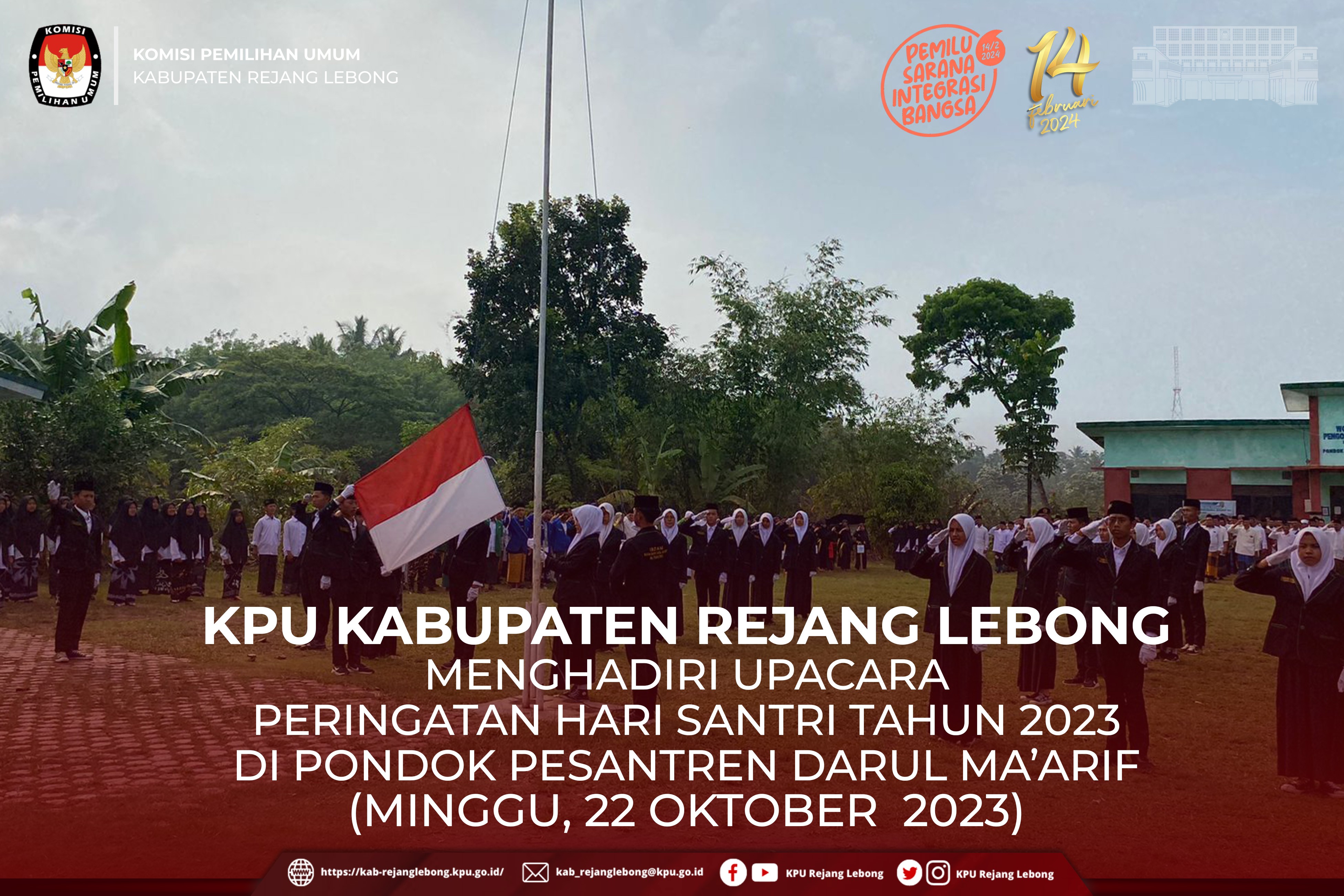 #TemanPemilih, Ketua KPU Kabupaten Rejang Lebong Ujang Maman beserta Anggota KPU Kabupaten Rejang Lebong Buyono dan Muhammad Anas Kholiq, menghadiri Upacara Peringatan Hari Santri Tahun 2023 di Pondok Pesantren Darul Ma'arif Kecamatan Curup Utara, Minggu (22/10) Pagi.