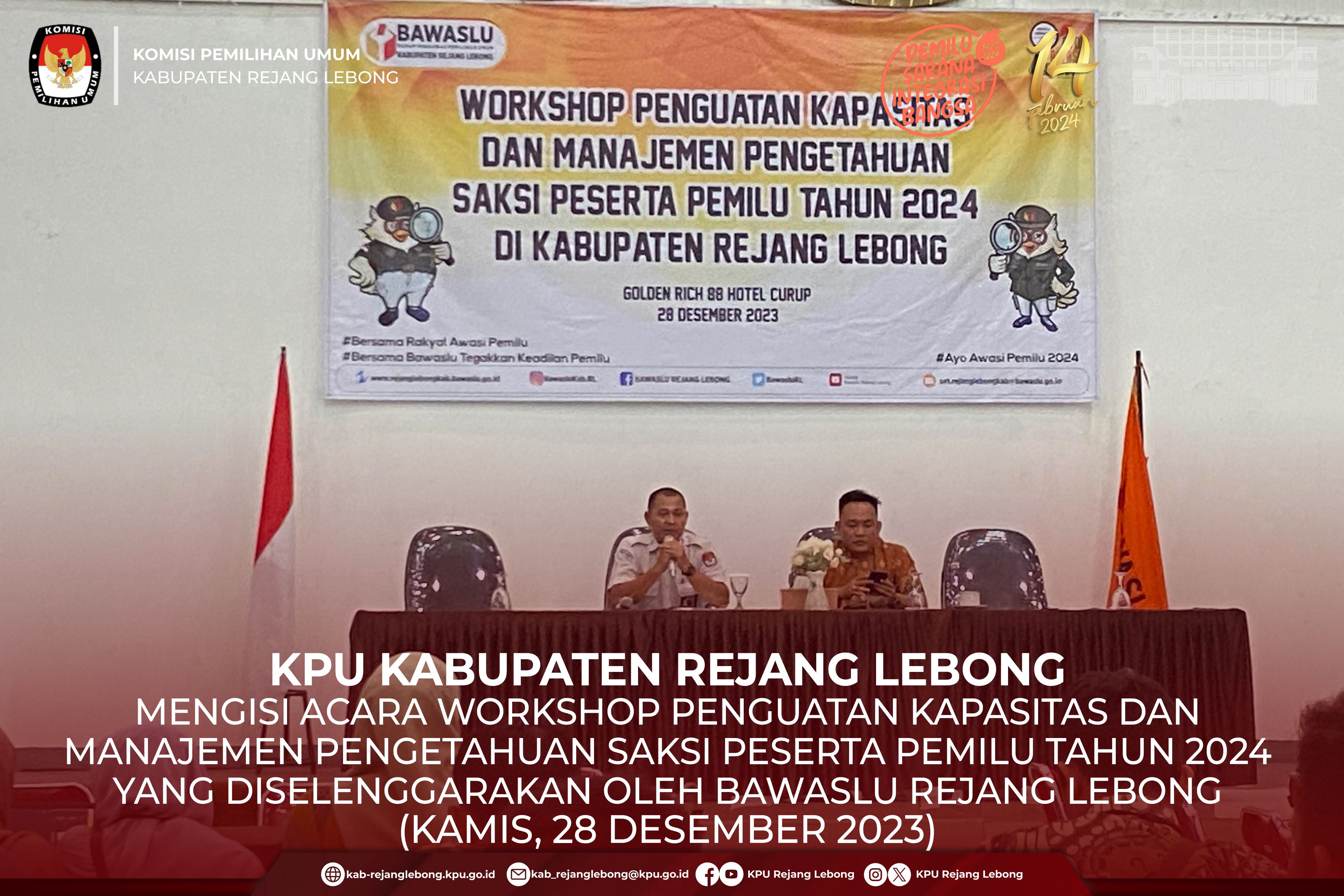 #TemanPemilih, KPU Kabupaten Rejang Lebong menjadi salah satu narasumber dalam acara Workshop Penguatan Kapasitas dan Manajemen Pengetahuan Saksi Peserta Pemilu Tahun 2024 di Kabupaten Rejang Lebong yang diselenggarakan oleh BAWASLU Rejang Lebong, dalam hal ini Kemas Amir Hamzah Staff TPPPHM KPU Kabupaten Rejang Lebong yang menjadi narasumber mengenai Teknis Pemungutan dan Penghitungan Suara oleh KPPS di TPS dalam kegiatan yang diselenggakan di Golden Rich 88 Hotel, Kamis (28/12) Siang.
